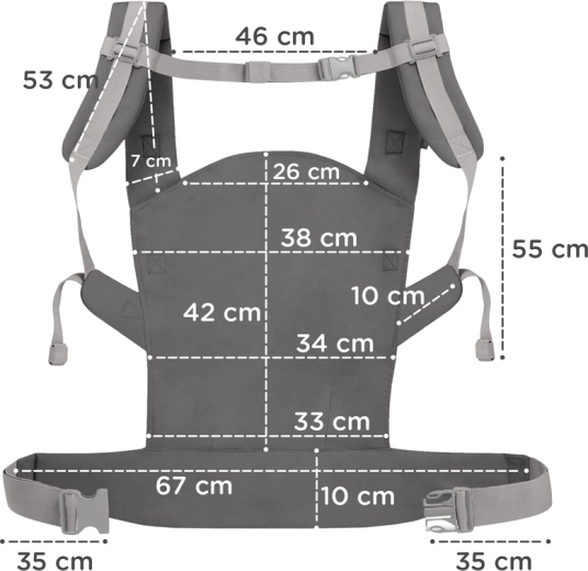 Det brede hoftebælte (10 cm) og de polstrede skulderstropper fordeler barnets vægt og øger komforten selv ved længere tids bæring. Elastikker holder stroppenes ender sikkert på plads.