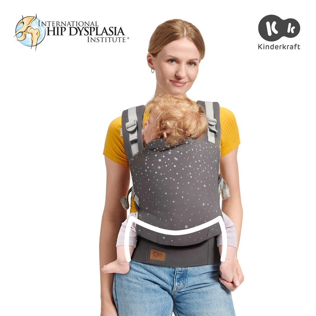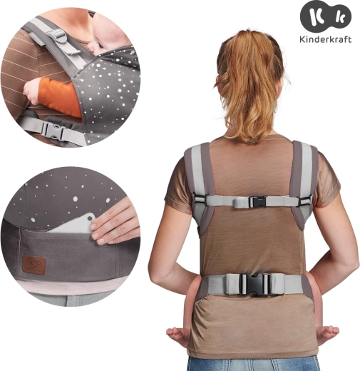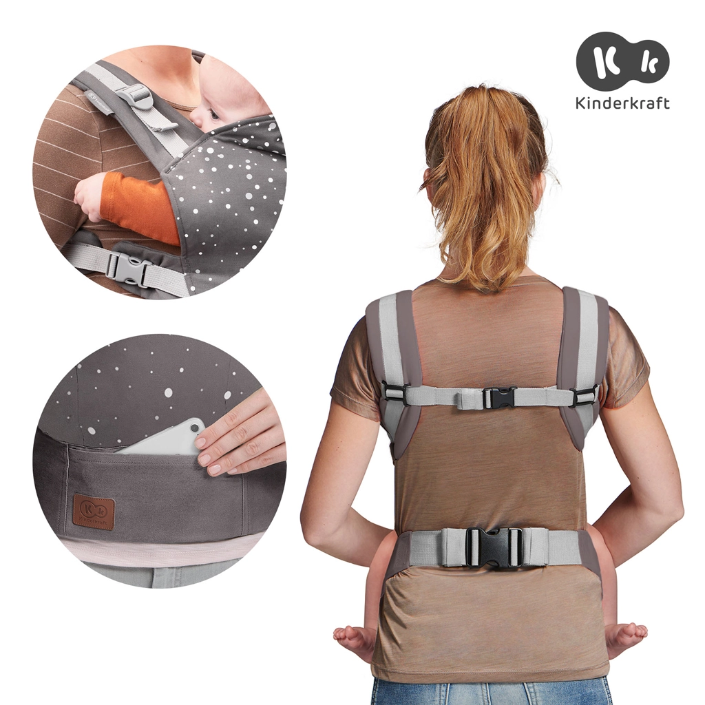 Den ergonomiske bæresele Kinderkraft Nino i det stilfulde design Confetti Grey er en komfortabel løsning til at bære børn fra 3 måneder op til 20 kg. Den tilbyder to bærestillinger (på maven og på ryggen), trinvøs justering af panelet og bredt hoftebælte for jævn vægtfordeling. Den er lavet af 100% bomuld, muliggør naturlig M-position og har positiv vurdering fra IHDI for sund hofteudvikling.
