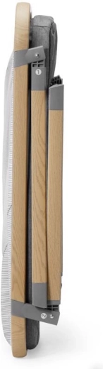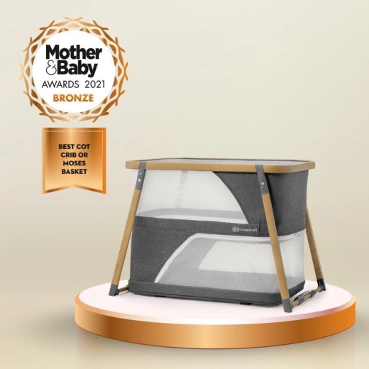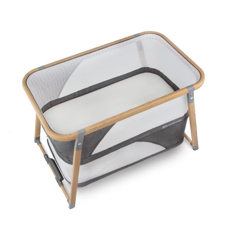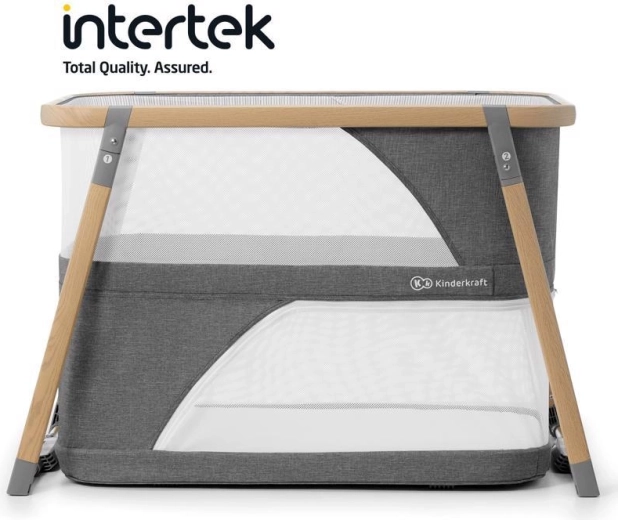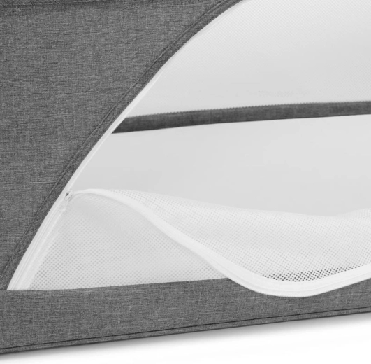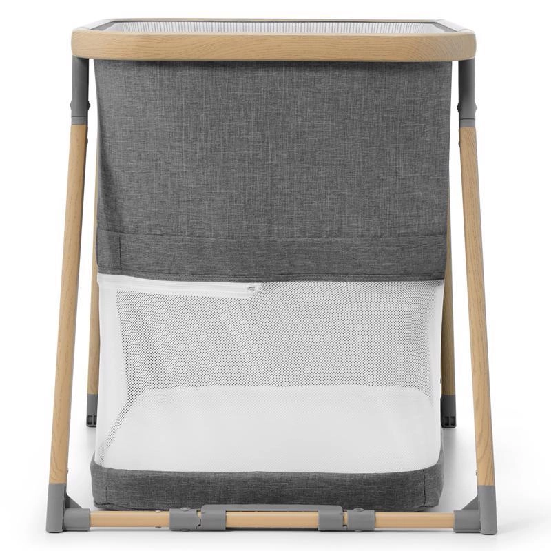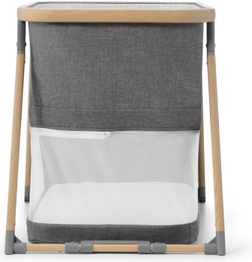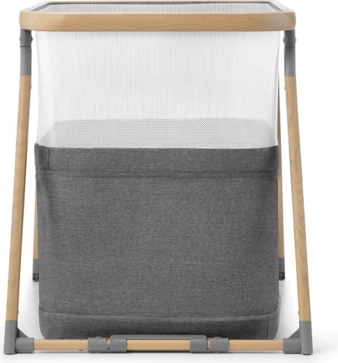 Netpaneler fremmer luftcirkulationen og giver visuel kontakt med barnet, mens aluminiumsrammen i trælook sikrer stabilitet.