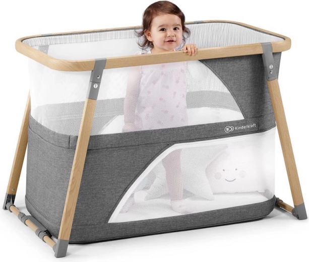 Den multifunktionelle krybbe 4-i-1 KINDERKRAFT Sofi i elegant grå kombinerer krybbe, rejseseng, legegård og vugge. Den tilbyder hurtig foldning på 5 sekunder, en let aluminiumsramme i trælook, åndbare net-sider og en kvalitets skummadras for sikker og behagelig søvn og leg både hjemme og på farten.
