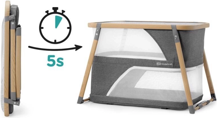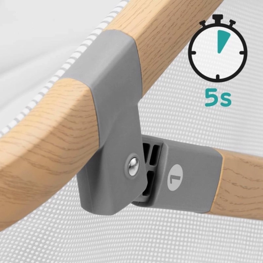 Konstruktionen i let aluminium med trælook giver stabilitet og lav vægt, perfekt til rejser. Systemet til hurtig foldning og udfoldning uden værktøj sparer tid – foldet på 5 sekunder. Medfølger gør en kvalitets skummadras med øget elasticitet og holdbarhed samt en praktisk transporttaske. Sofi modtog en pris på messen Kid’s Time 2019.