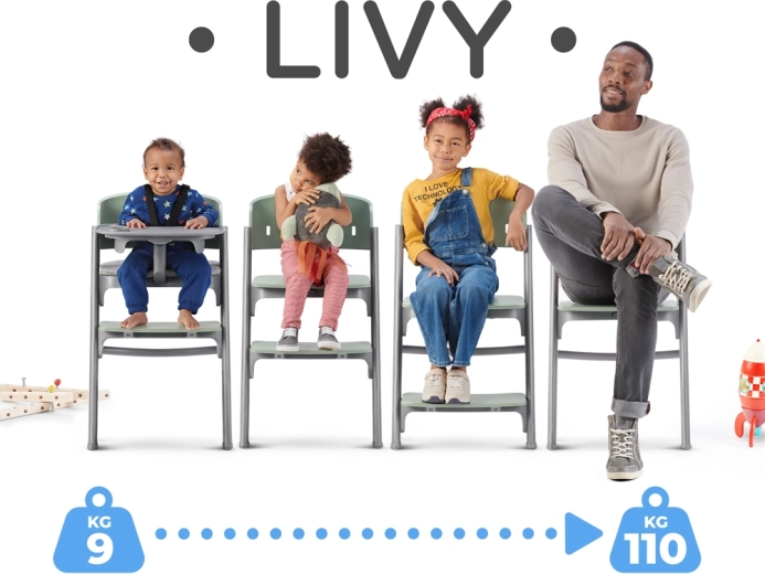 KINDERKRAFT LIVY er en multifunktionel 3-i-1 stol – den fungerer som høj højstol, selvstændig stol til det større barn og ergonomisk stol til teenagere (eller endda til forældre). Den vokser med barnet takket være justerbar sædedybde (3 niveauer), højde (4 positioner) og fodstøtte. Det brede sæde og den formede ryglæn støtter korrekt kropsholdning ved spisning, leg og læring.