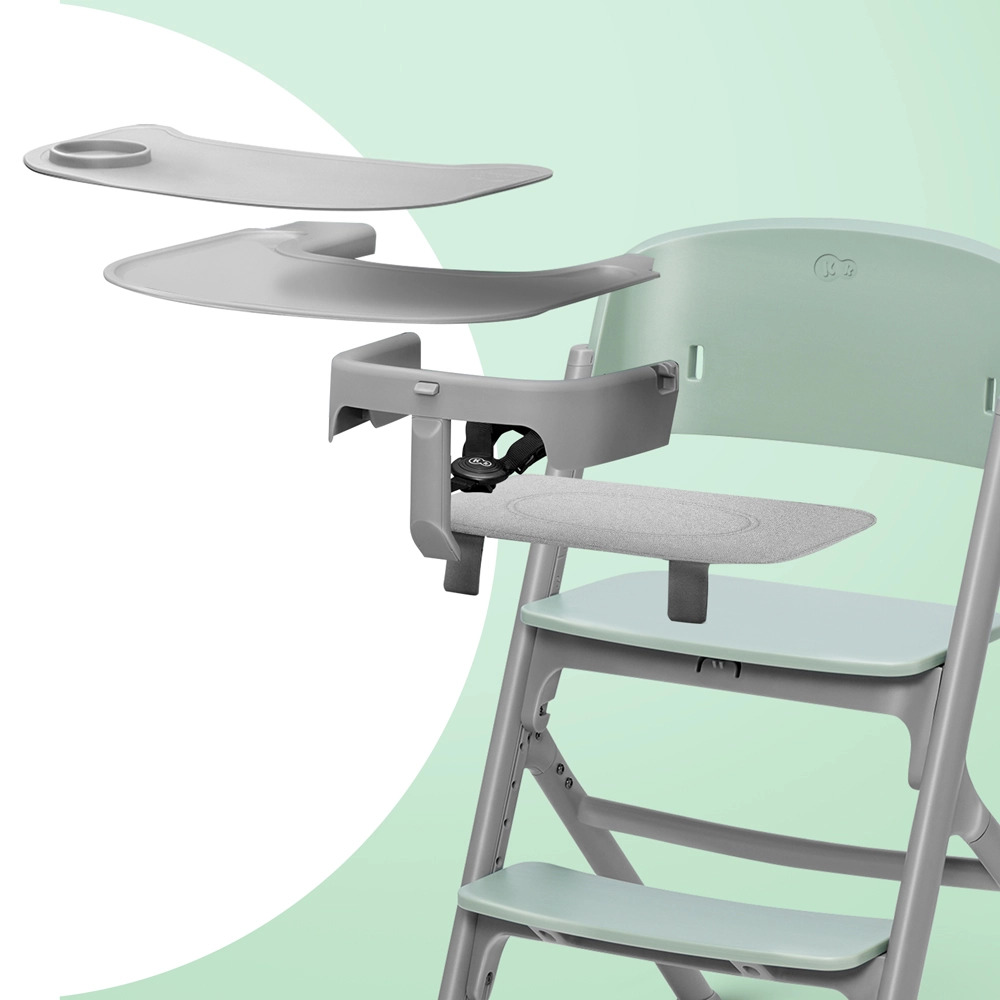 Sikkerheden sikres af 5-punkts seler med justerbar længde og en stærk, stabil konstruktion i stål og aluminium med bred benafstand. Den store, praktiske bakke med skridsikkert silikoneindlæg (BPA-frit) kan gå i opvaskemaskinen. Du kan tilslutte CALMEE-liggedelen til stolen og skabe en høj liggedel, så du altid har din baby i øjenhøjde.