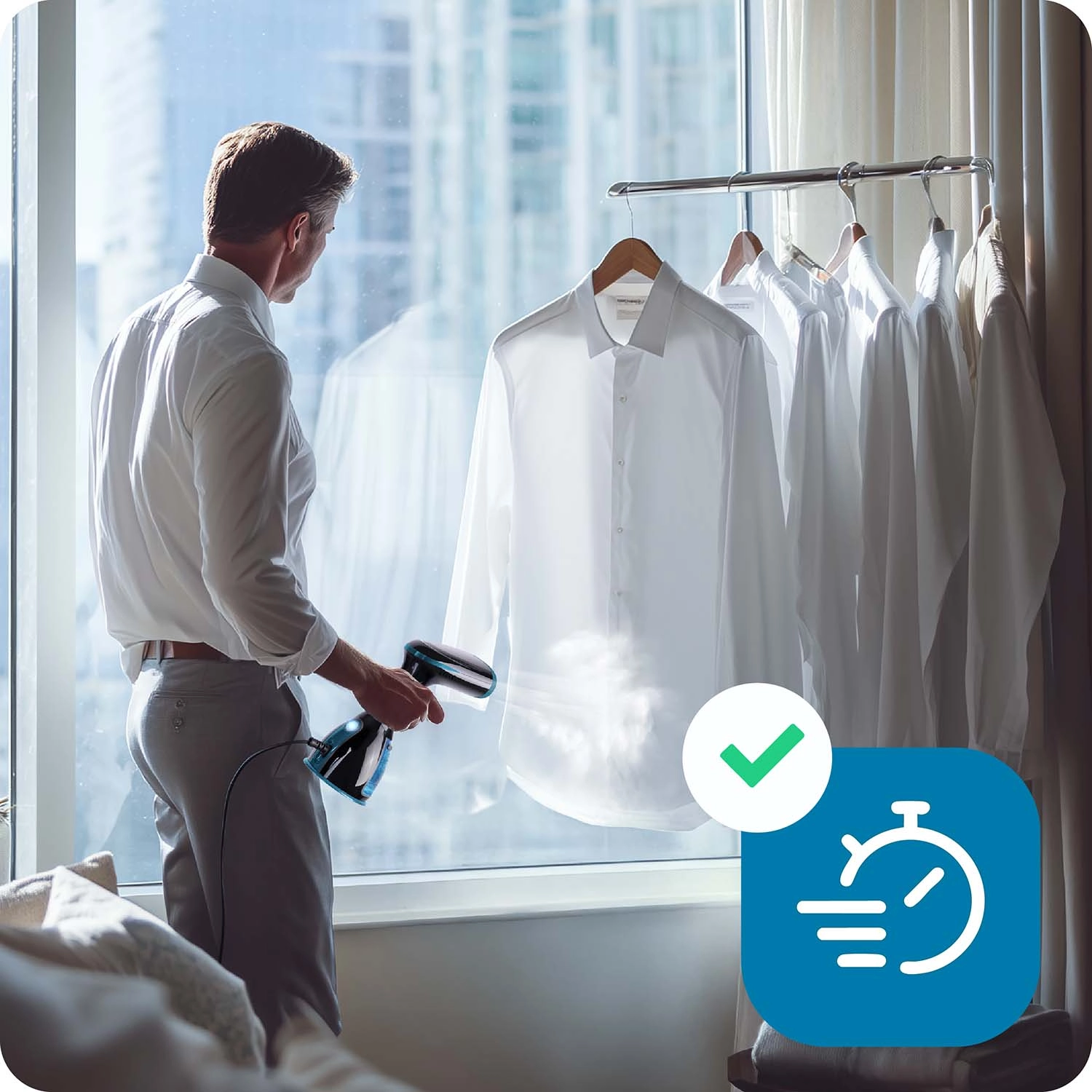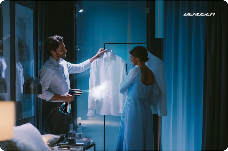 Ingen flere strygebrætter og lang ventetid. Den håndholdte BERDSEN-steamer glatter en skjorte på 1 minut direkte på bøjlen. Takket være dampydelse på 32 g/min klarer den selv mere genstridige folder, mens 280 ml-tanken sikrer længere uafbrudt drift. Den praktiske bagbelyste knap gør betjeningen let, og funktionen for tørstrygning udvider anvendelsen alt efter materialetype.