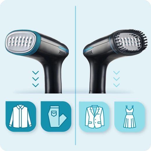 - Bred anvendelse: uden mundstykke til glatte og robuste stoffer (skjorter, bukser, bomuld), med børstemundstykke til sarte materialer (strik, silke, tynde kjoler).