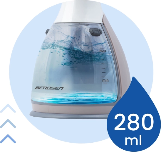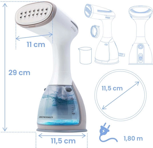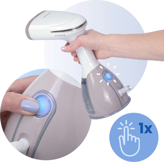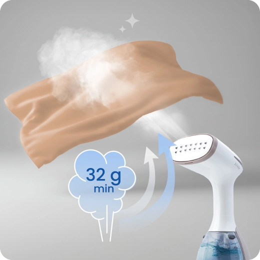 Glem besværet med strygebrættet – glat tøjet direkte på bøjlen. Dampydelse på op til 32 g/min klarer også mere genstridige folder, og på ét minut er skjorten klar til brug. Den store tank på 280 ml forlænger dampningen, og takket være den bagbelyste knap er betjeningen meget intuitiv.