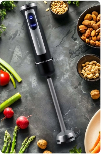 Opdag en alsidig hjælper til køkkenet: Berdsen stavblender med en ekstremt kraftig 1500 W motor og Turbo-funktion klarer alt fra bløde frugter til hårde nødder. Titanblade GOLD sikrer lang levetid, præcist snit og nem vedligeholdelse. Med 25 hastigheder justerer du nemt den ideelle effekt til supper, saucer, smoothies og puréer.