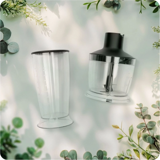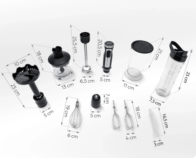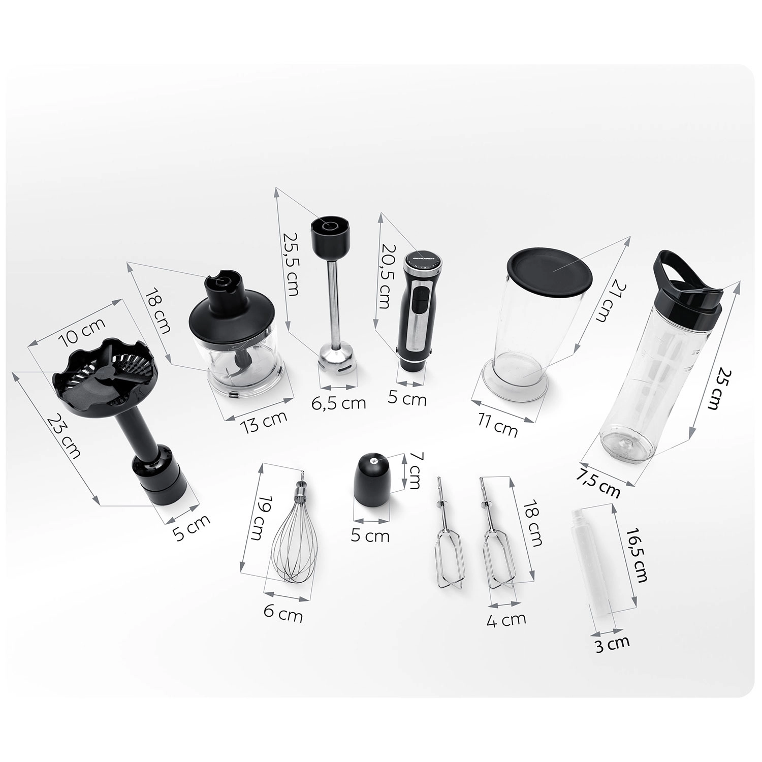 Det rige tilbehør dækker op til 7 køkkenfunktioner: immersionsblending, hakning, piskning, æltning/omrøring, tilberedning af puré og smoothies i den bærbare 600 ml flaske (BPA-fri) med praktisk drikkelåg og køleelement. Sikkerhedsfunktioner som lås mod forkert samling og overophedningsbeskyttelse giver ro i arbejdet.