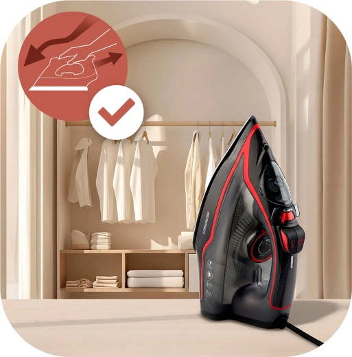 • Keramisk strygesål – glat glideevne, jævn damp og modstandsdygtig over for ridser.