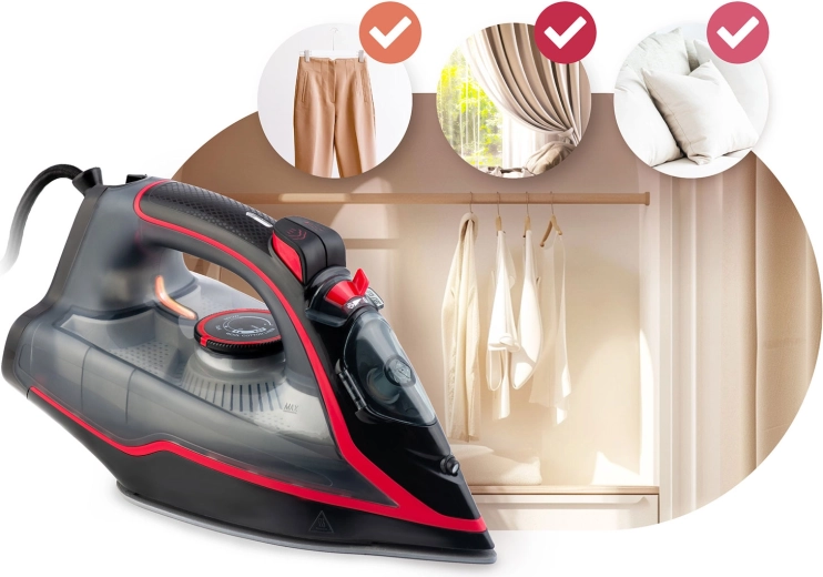 • Vertikal damp – hurtig opfriskning af tøj, netgardiner og gardiner uden strygebræt.