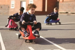Kør frem og tilbage blot ved at dreje de robuste styr – uden batterier, uden kæder, uden bekymringer.