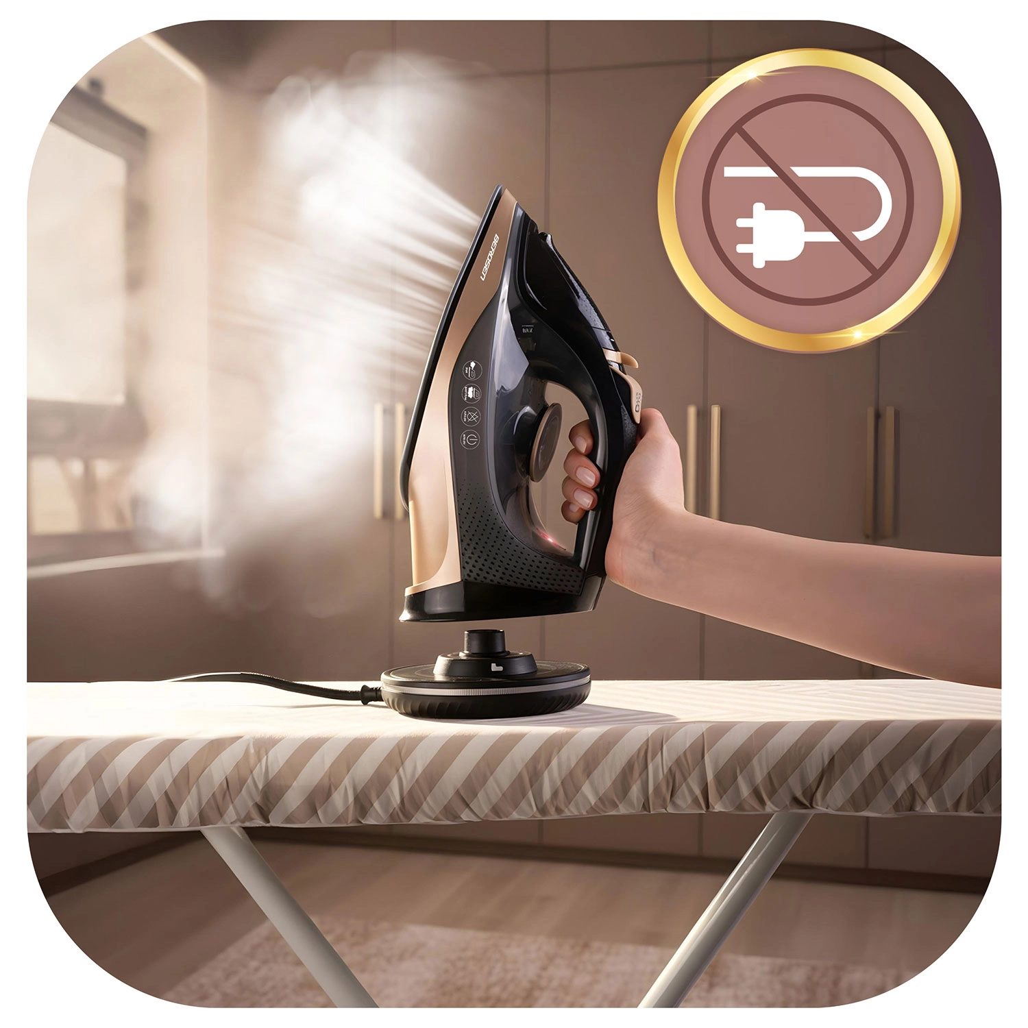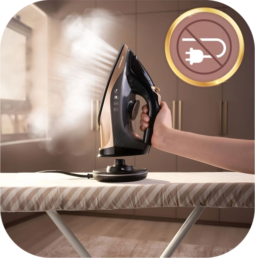 Brug strygejernet frit uden kabel, eller lås basen og stryg som med en klassisk model – altid stabil temperatur og jævn arbejdsflow.
