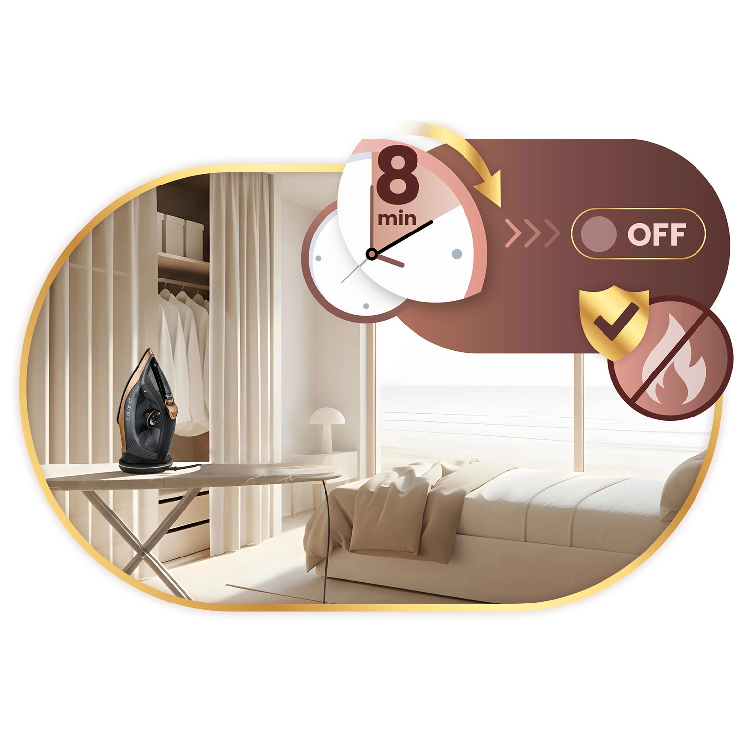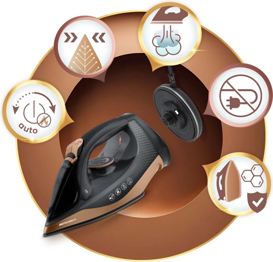 Auto-Off (Smart&Safe) slukker strygejernet efter 8 minutters inaktivitet. Self Clean gør rengøringen let og forlænger levetiden.