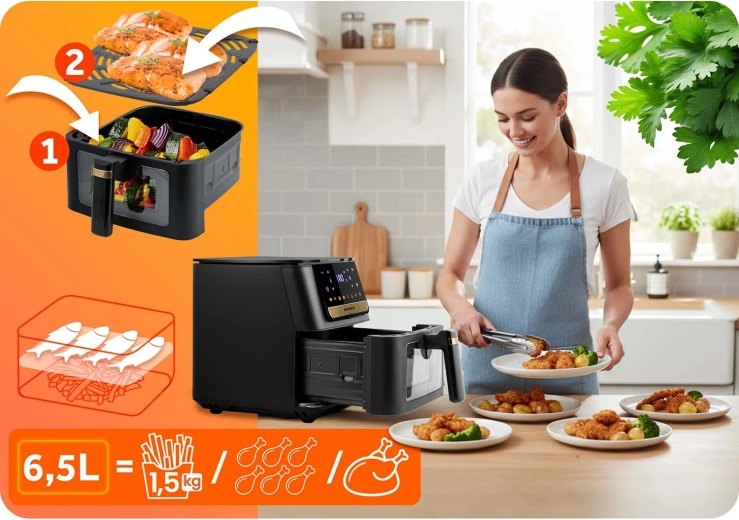 XXL-kurven rummer en hel frossen pizza, større portioner pommes frites og endda en hel kylling. Ideel til hurtige familiemiddage uden kompromiser.