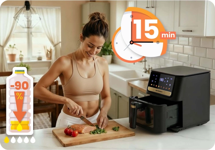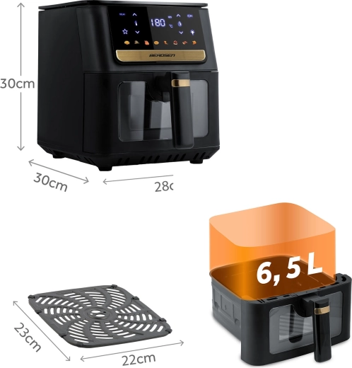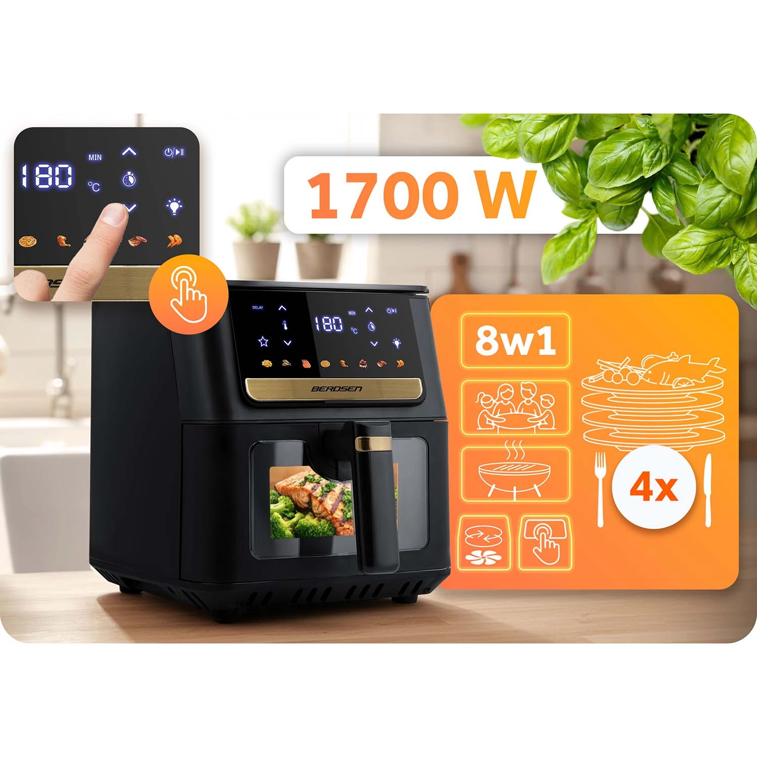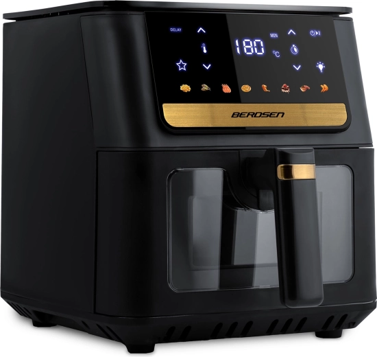 BERDSEN varmluftsfriture giver hurtig og jævn tilberedning af favoritterne uden unødvendig olie. Den store 6,5 l kurv rummer portioner til hele familien – fra pommes frites, kyllingevinger og bøffer til en hel kylling. LED-belysning og inspektionsvindue lader dig holde styr på det hele uden at afbryde tilberedningen, mens touchdisplayet byder på tydelige ikoner og forudindstillinger for nem programvalg.