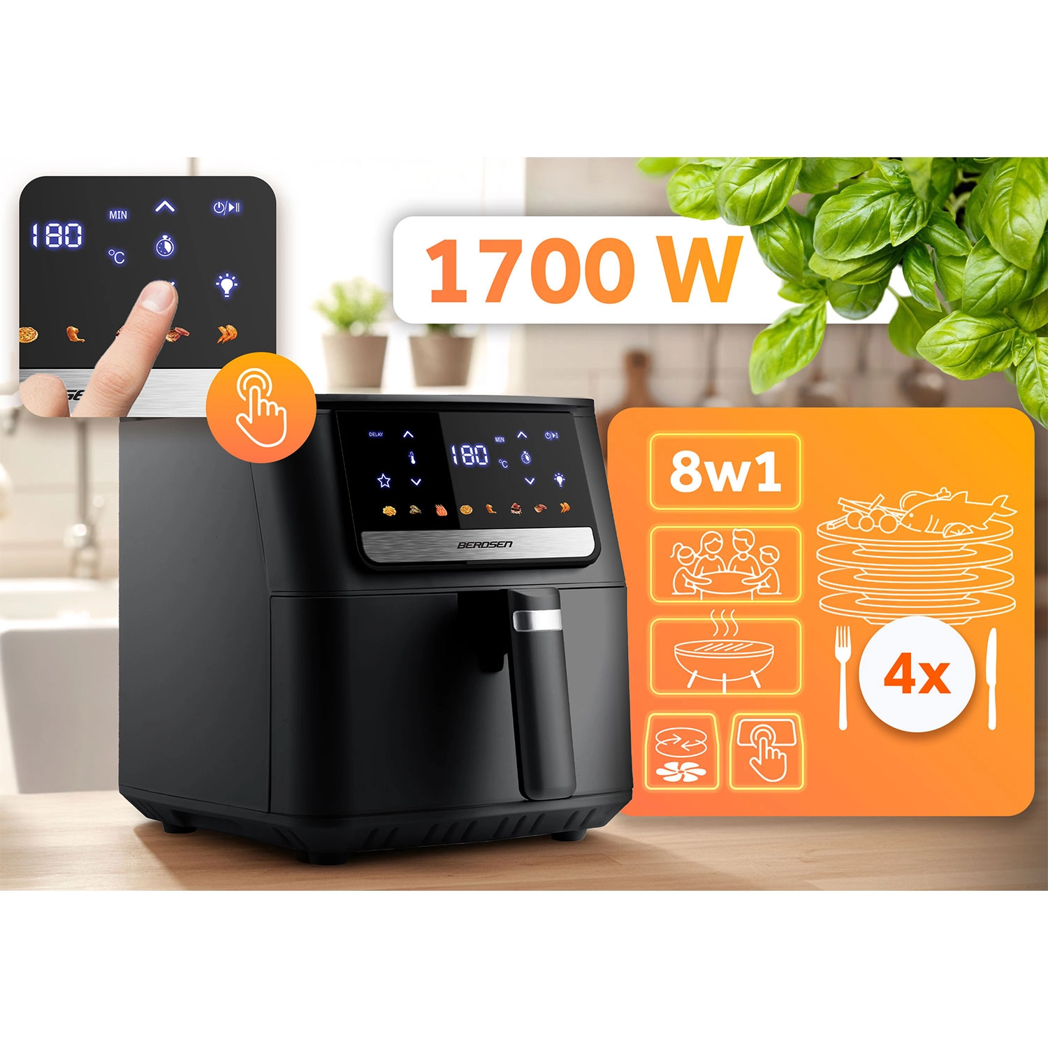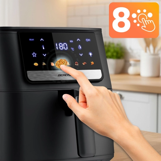 Modellen BERDSEN BD-662 kombinerer stil og funktionalitet: intuitivt touchpanel med tydelige ikoner, 8 programmer til pommes frites, fisk, kylling, rejer, steaks, kager, pizza og vinger samt temperaturindstilling op til 200 °C. Med en kapacitet på 6,5 l kan du lave middag til familien, en stor skål pommes frites til vennerne eller endda en hel kylling. Kurv og bakke kan gå i opvaskemaskinen, og enheden har automatisk slukning og overophedningsbeskyttelse.