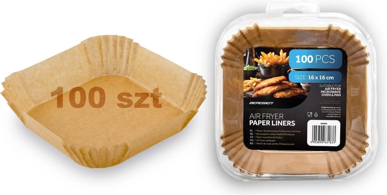Praktiske papirindsatser til airfryer hjælper dig med at tilberede sprøde retter og holder samtidig kurv og skuffe rene. Takket være den non-stick overflade sætter maden sig mindre fast, og efter tilberedning kan indsatsen nemt smides ud. I pakken finder du 100 stk. kvadratiske indsatser på 16 × 16 cm med kant for bedre pasform i kurven.