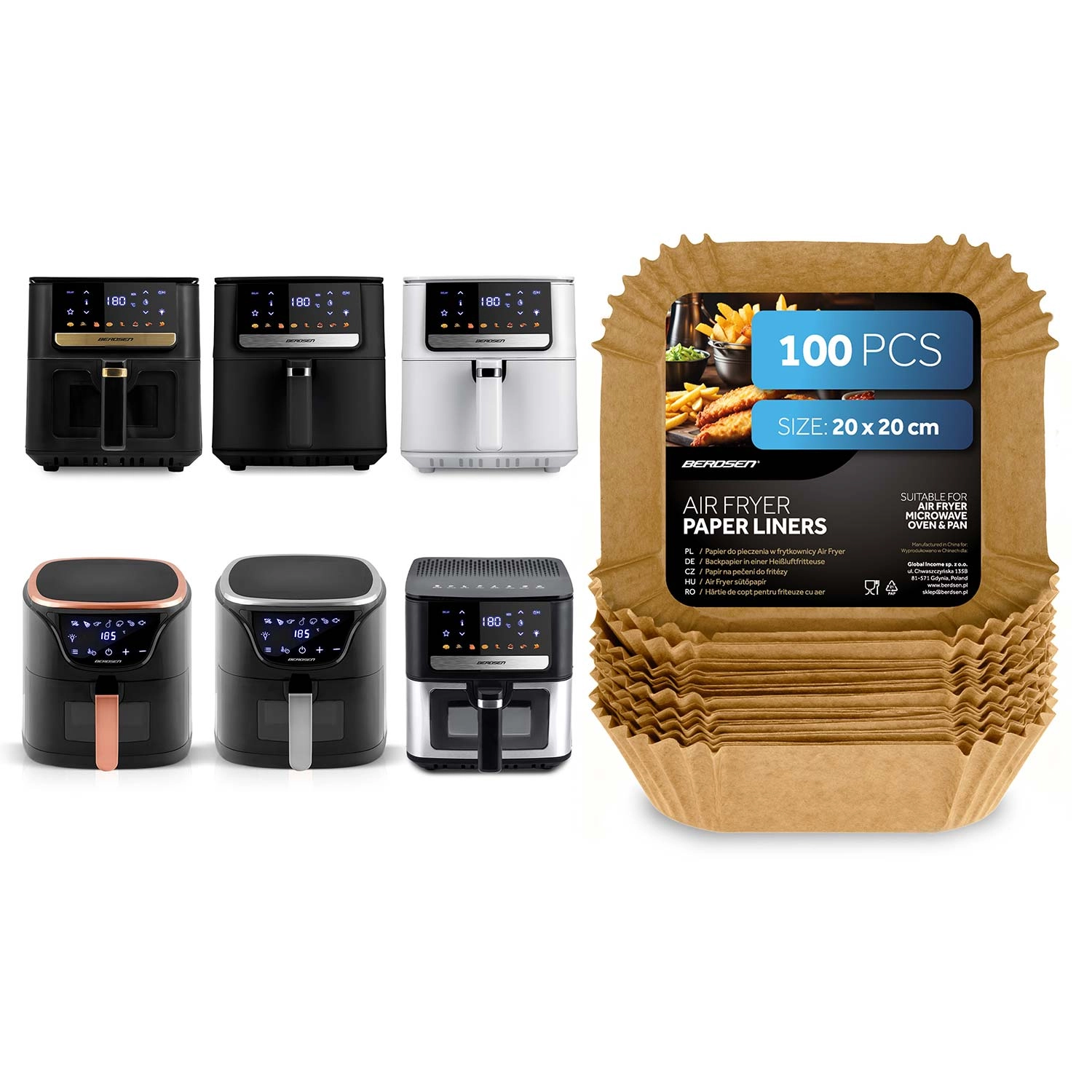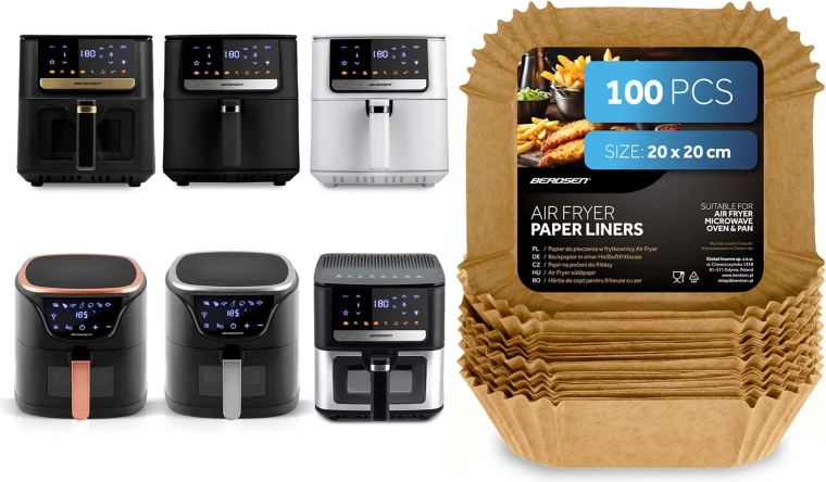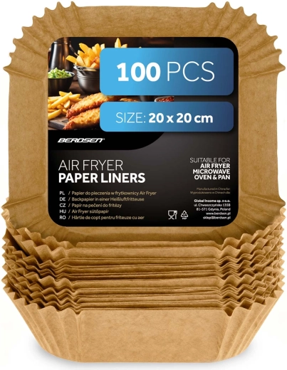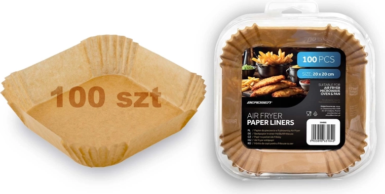 Firkantede papirindsatser 20 × 20 cm er ideelle til airfryere, men også til mikrobølgeovn, almindelig ovn eller pande. Engangs design og non-stick overflade gør det let at tage maden op og holder apparaterne hygiejnisk rene. Velegnet til pommes frites, kyllingevinger, nuggets og bagværk.