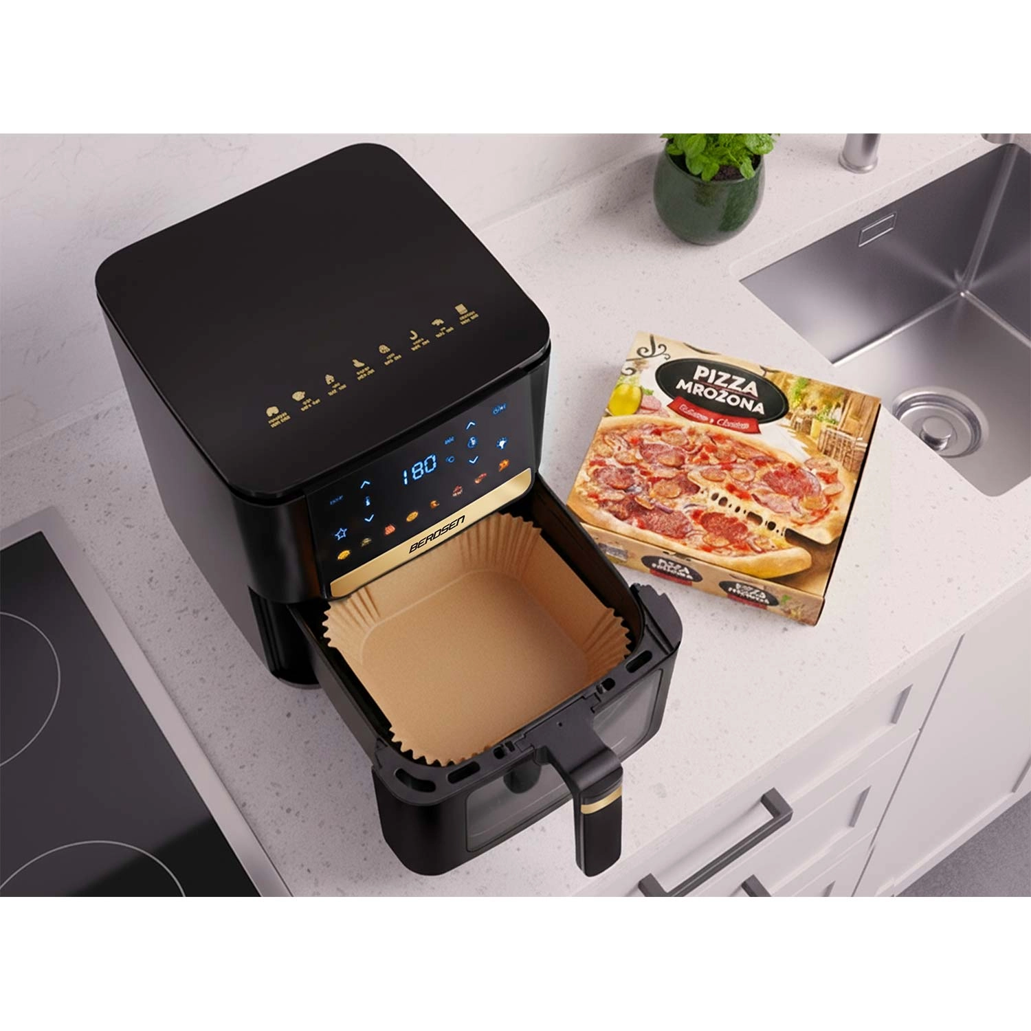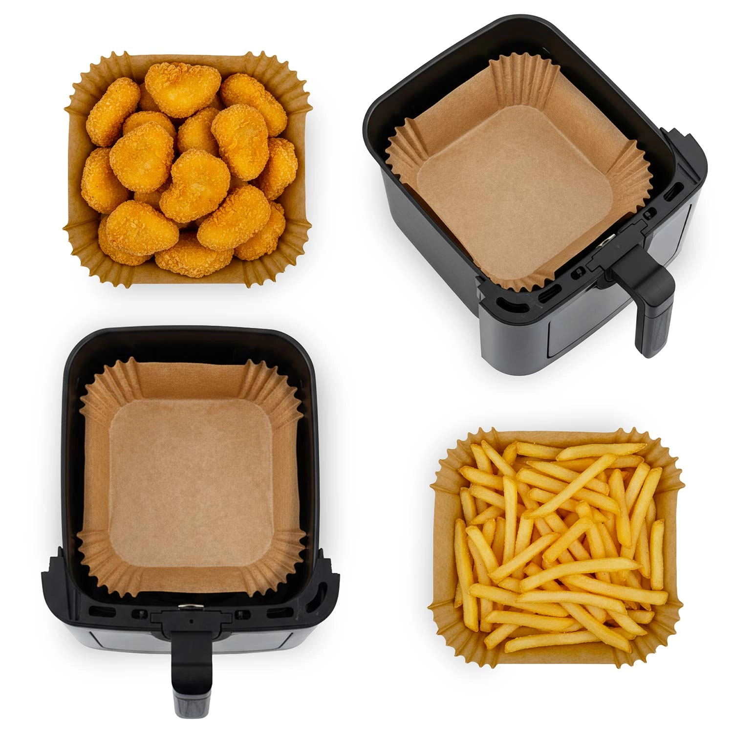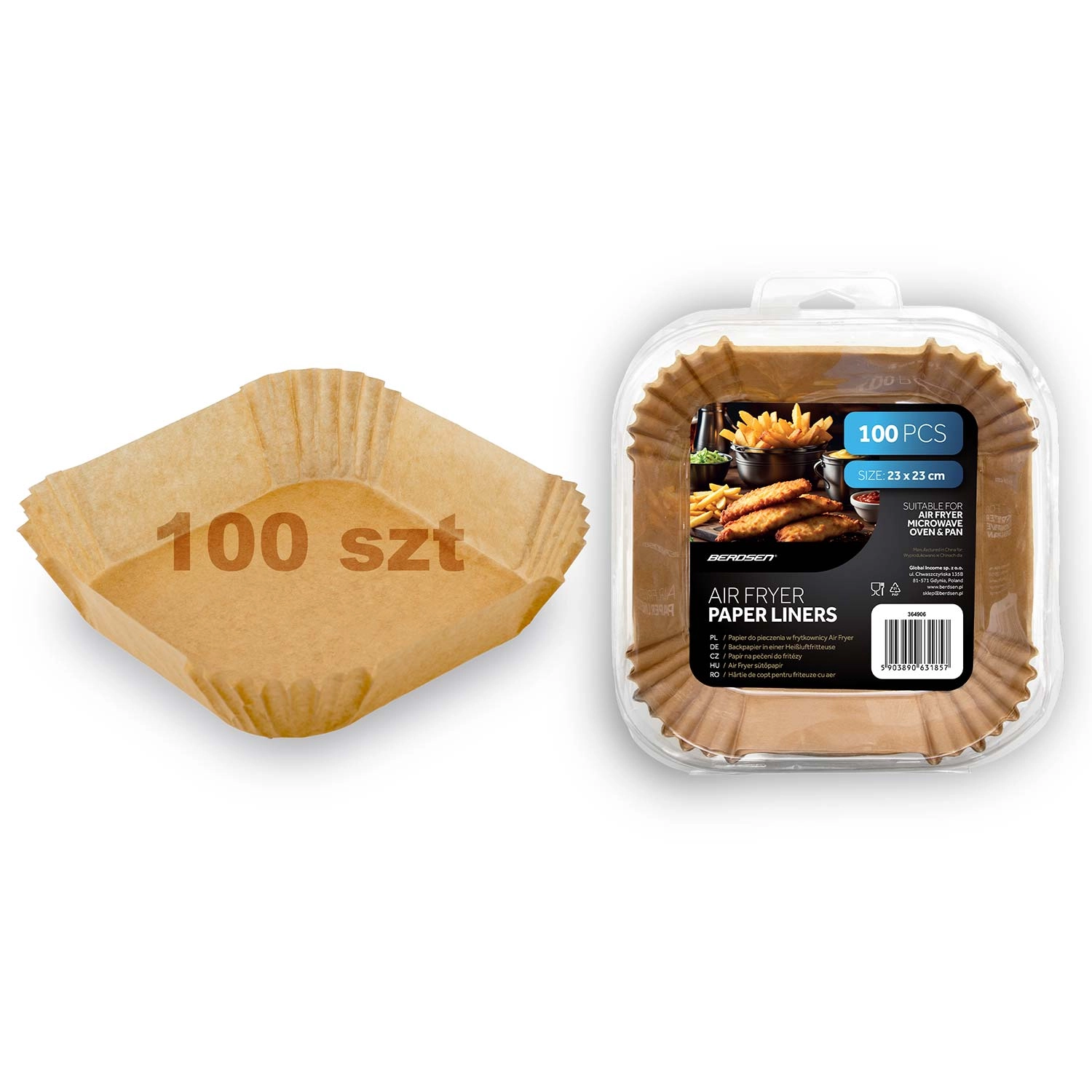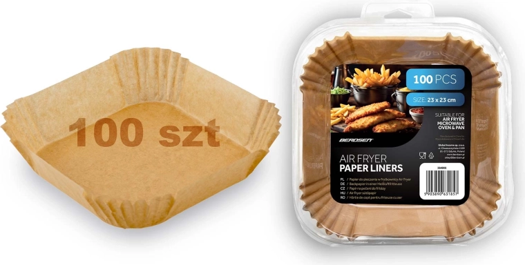 Praktiske papirindsatser til friture er fremstillet af bagepapir og formet som kvadrater med høje, foldede kanter (ca. 4,5 cm). De reducerer fastbrænding, gør det nemmere at tage maden op, og efter tilberedning kan indsatsen blot kasseres. Målet 23 × 23 cm passer til mange kurve, bradepander og er egnet til både mikrobølgeovn og ovn.