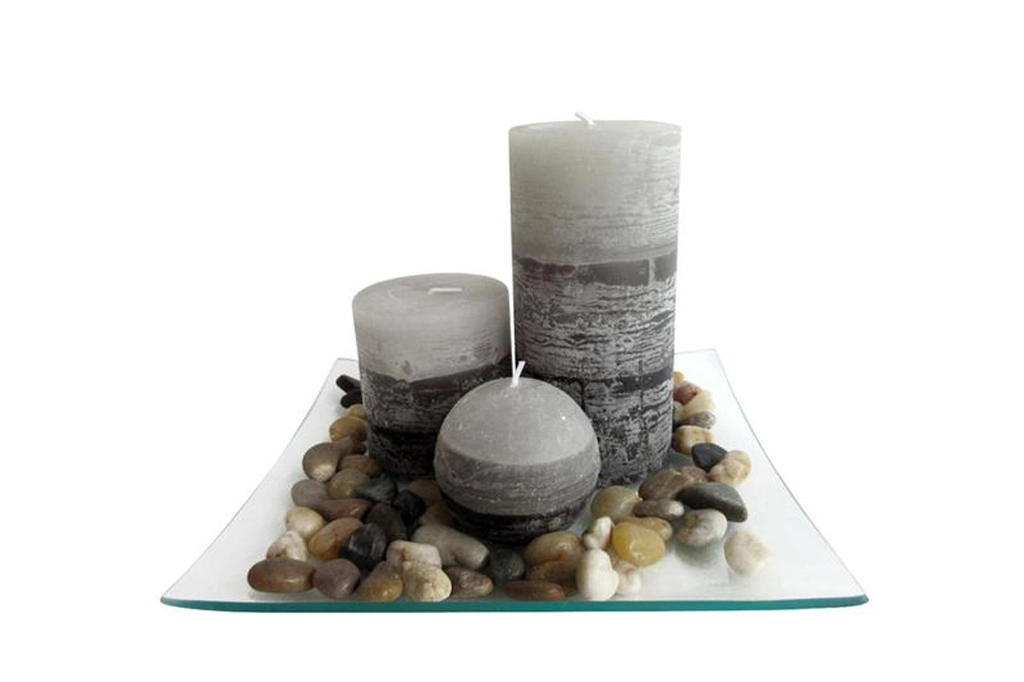 Dette harmoniske sæt indeholder tre designlys i forskellige former og størrelser, placeret på et solidt glasfad med naturlige sten. Jasmin-duften skaber en følelse af velvære, afslapning og renhed, hvilket gør den perfekt til hverdagsro såvel som festlige øjeblikke.