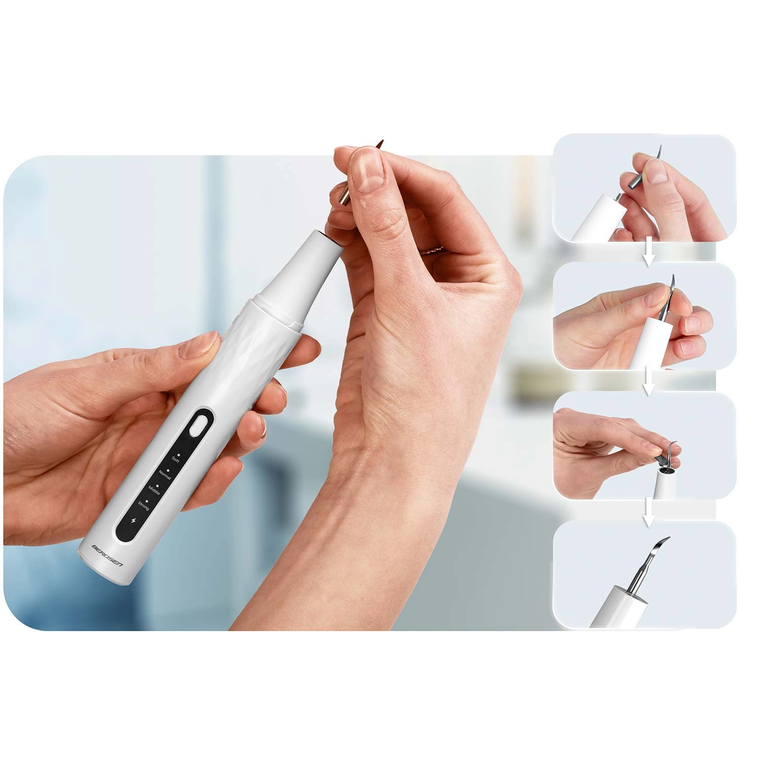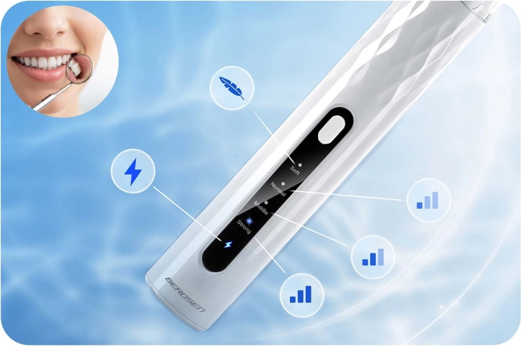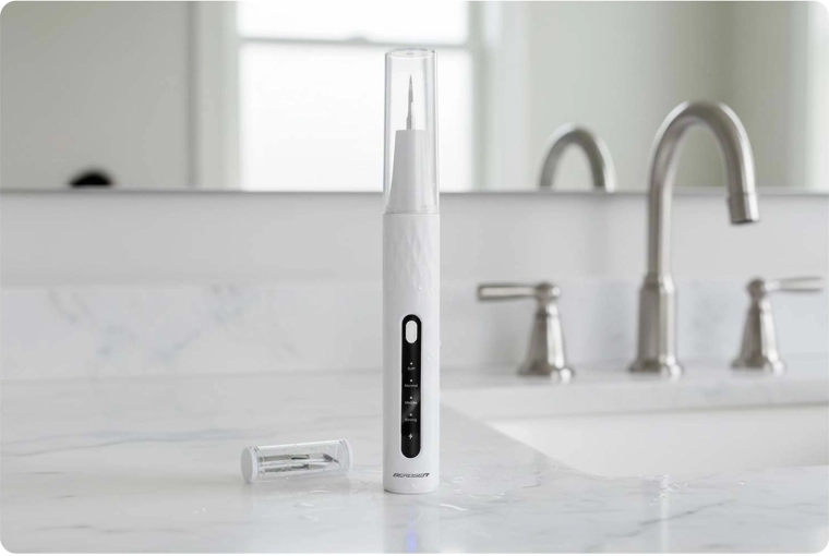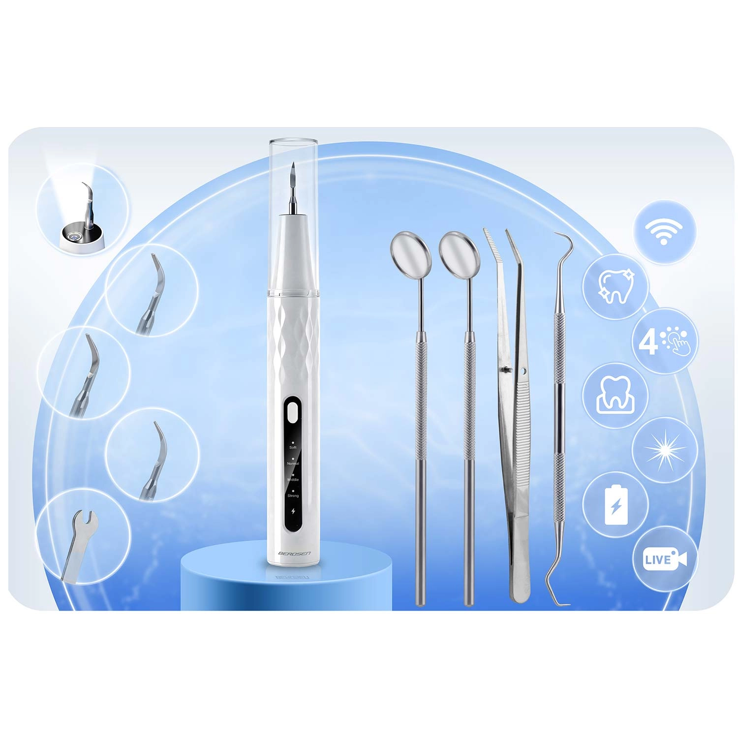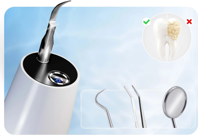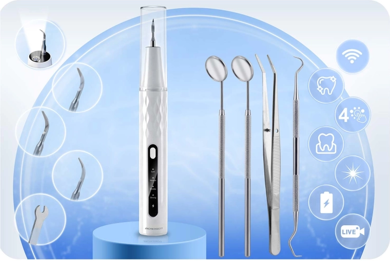 Hjemmetandpleje på professionelt niveau. BERDSEN ultralydsscaler med integreret 2 Mpx kamera og LED-belysning giver dig præcis visning af områder med tandsten og plak. Den tilbyder 4 arbejdstilstande (35–45 kHz) til alle følsomheder, automatisk stop ved berøring af blødt væv, IPX7 vandtæthed, lang batteritid med USB‑C-opladning og rigt tilbehør, herunder 4 udskiftelige hoveder og et sæt dentale værktøjer i rustfrit stål. Ideel til sikker og effektiv rengøring i hjemmets komfort.