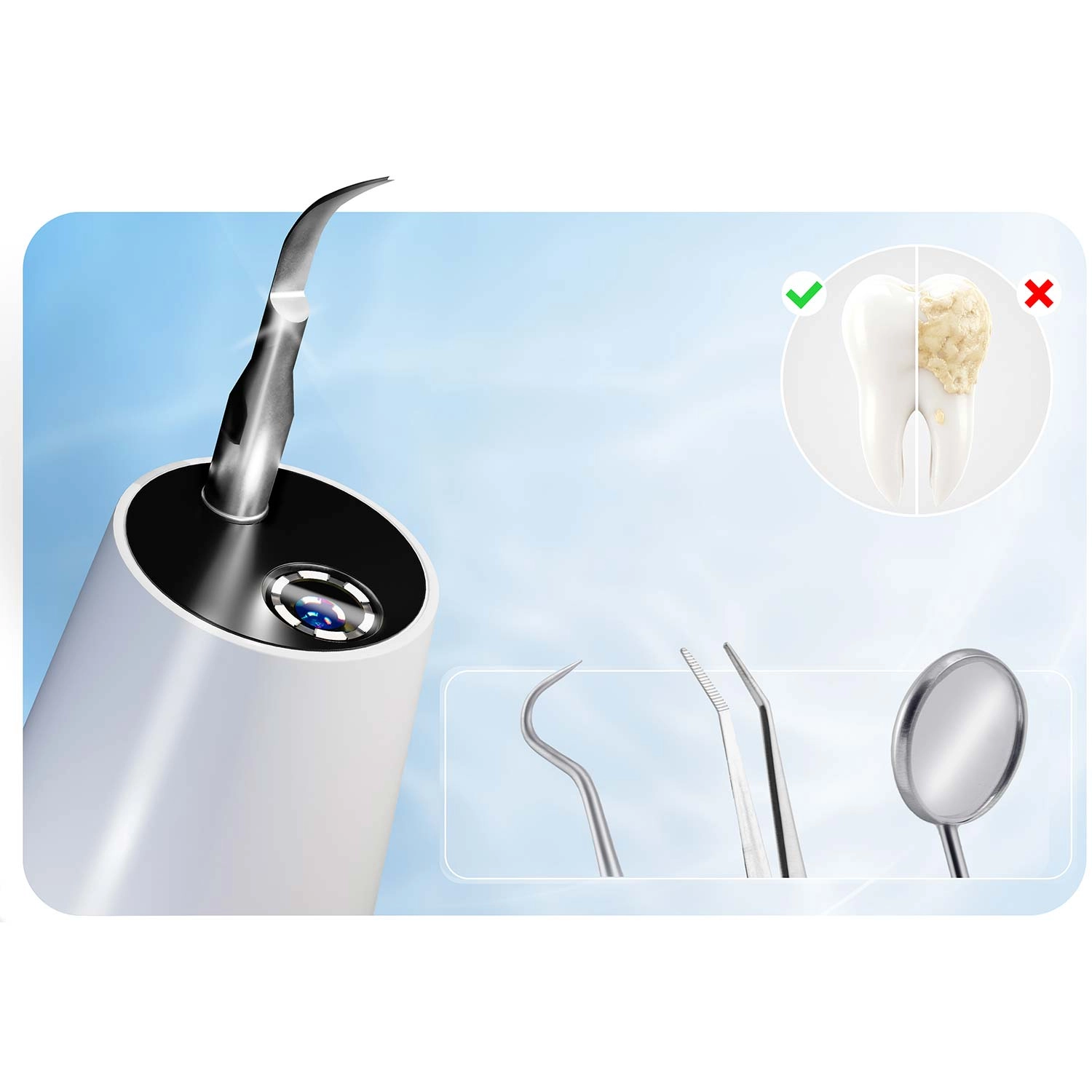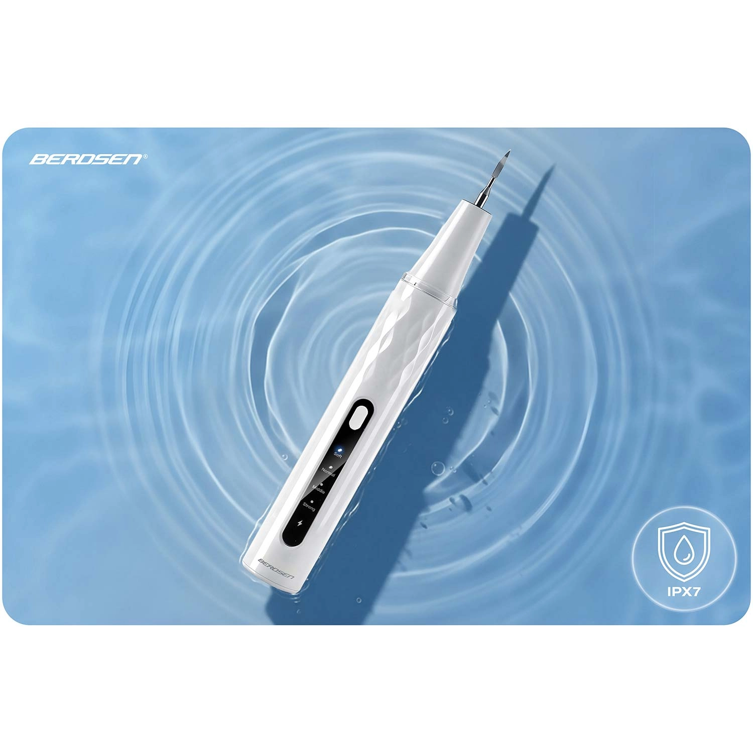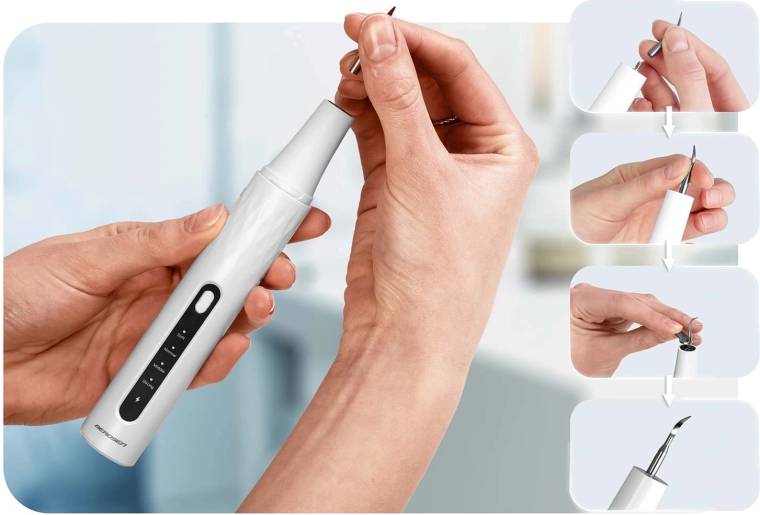 Sikkerhed først: Enheden stopper automatisk ved kontakt med tandkød eller tunge. Den soniske og ultralydsbaserede rengøringsteknologi er skånsom mod emalje og tandkød, men effektiv mod tandsten og belægninger. Takket være IPX7 er scalereren modstandsdygtig over for vand og stænk, LED-lyset øger præcisionen, og USB‑C-opladning gør daglig brug nem.
