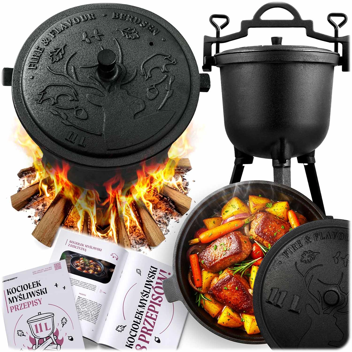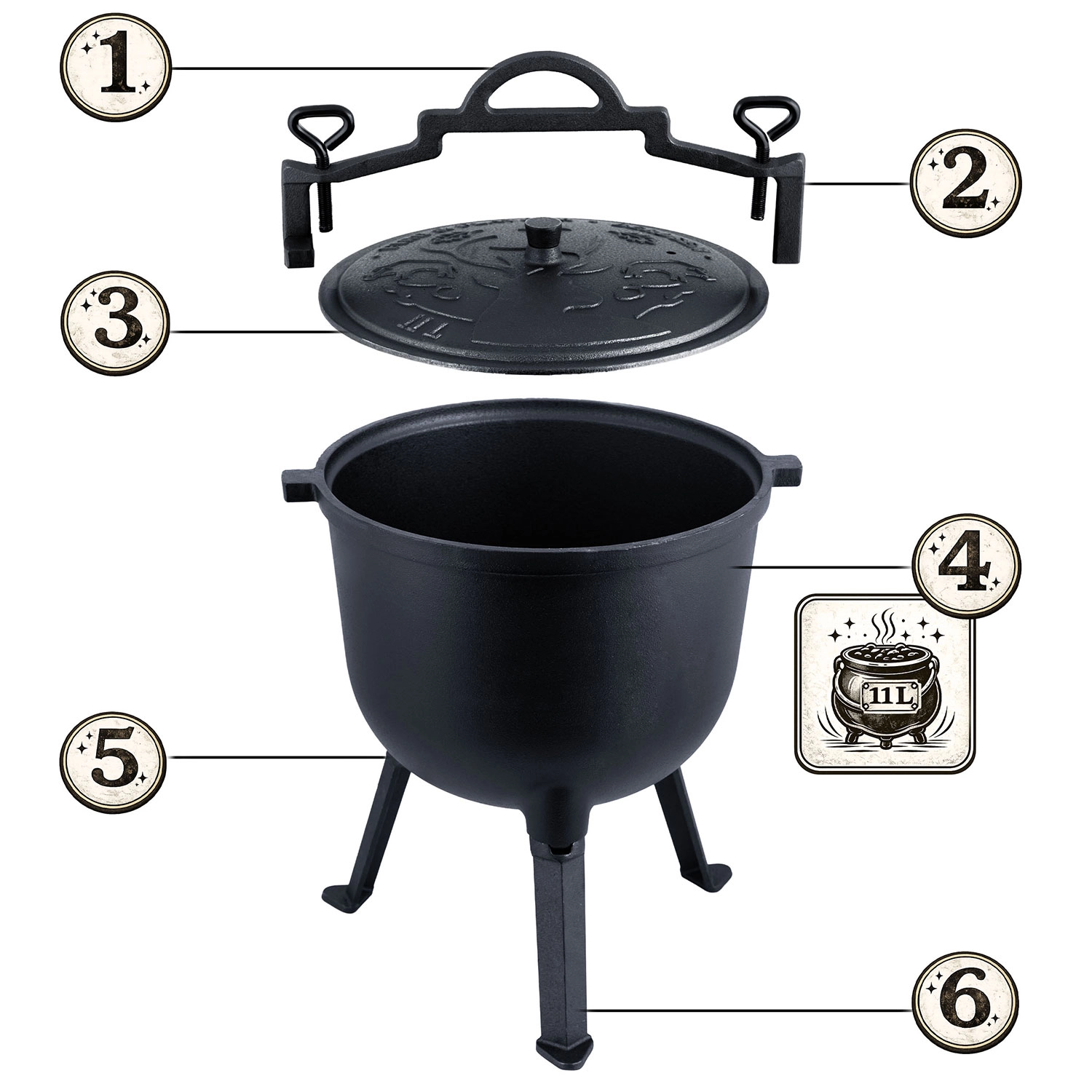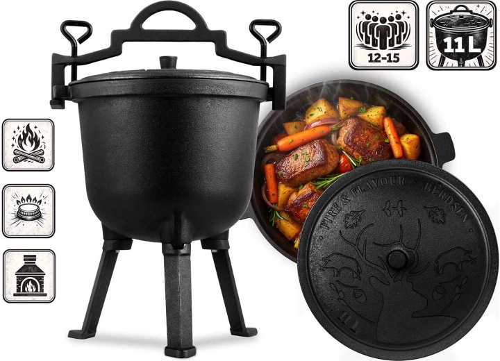 Oplev ægte udendørs madlavning med en robust støbejernsgryde på 11 l. Takket være de tykke vægge akkumulerer den varme effektivt, koger jævnt uden at brænde på og fremhæver den dybe smag i gullasch, stege og supper. Med låg med udluftning, aftagelige ben og bærehåndtag til ophæng er den klar til bål, grill og gasblus.