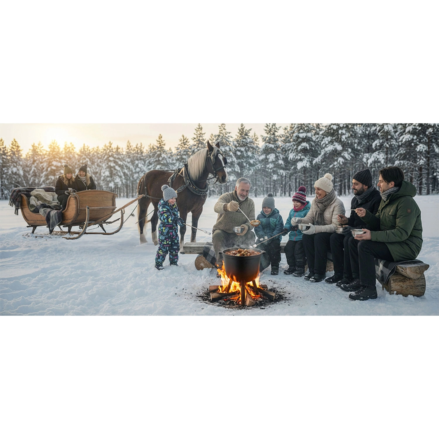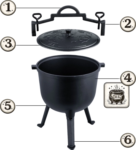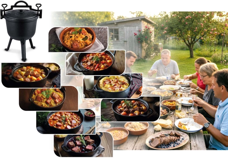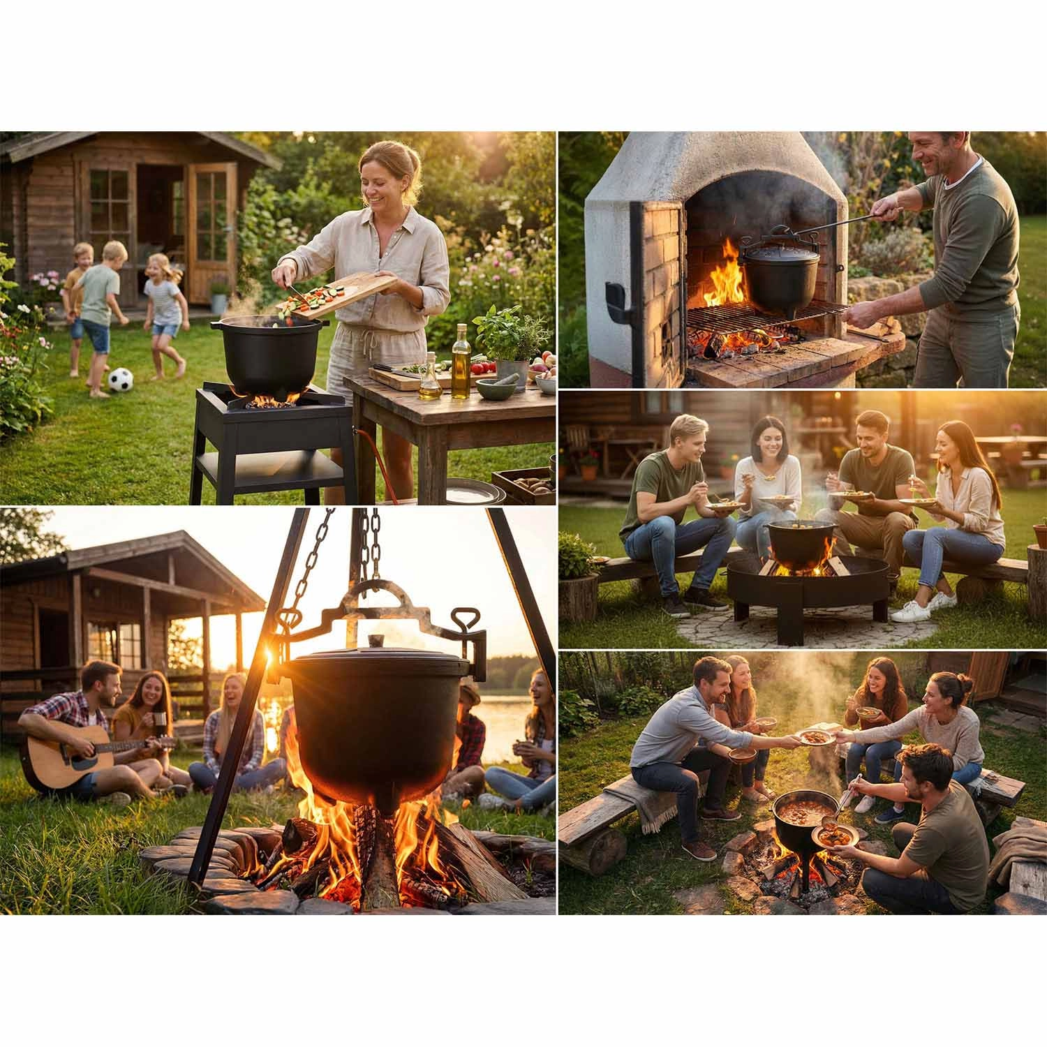 Den traditionelle støbejernsgryde er ideel til åben ild, havegrill og gaskomfur. Den massive konstruktion giver stabilitet, lang varmeholdning og rolig simring – kødet falder mørt fra hinanden, og grøntsagerne suger smagen til sig. Det tunge låg med udluftning holder både damp og aroma inde, så resultatet altid er saftigt og fuld af smag.