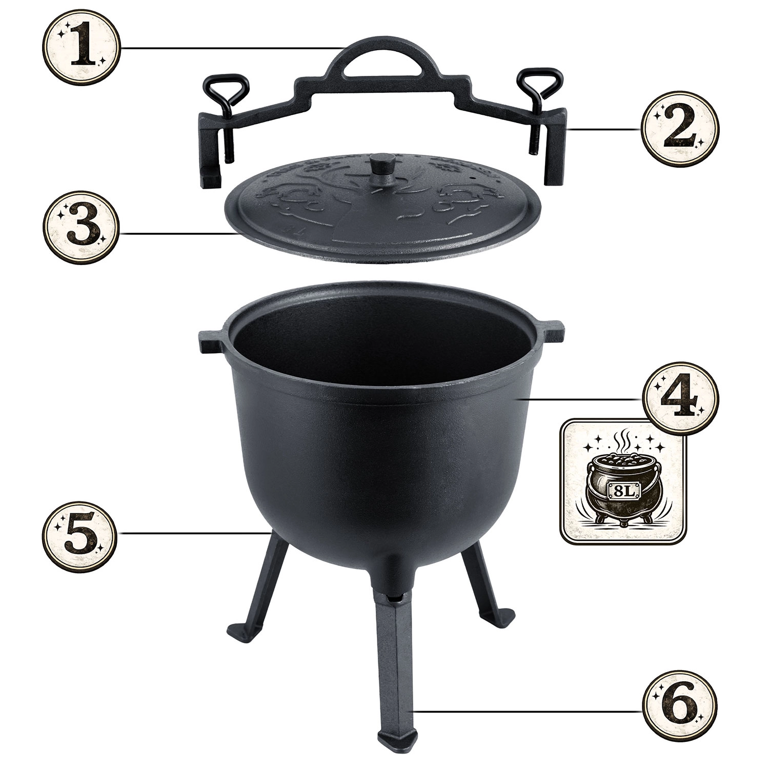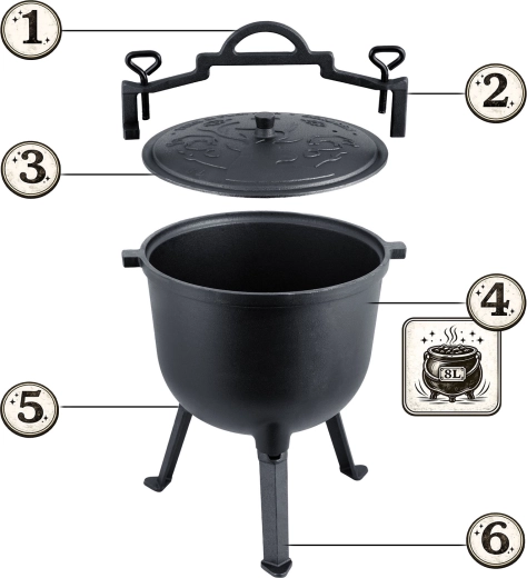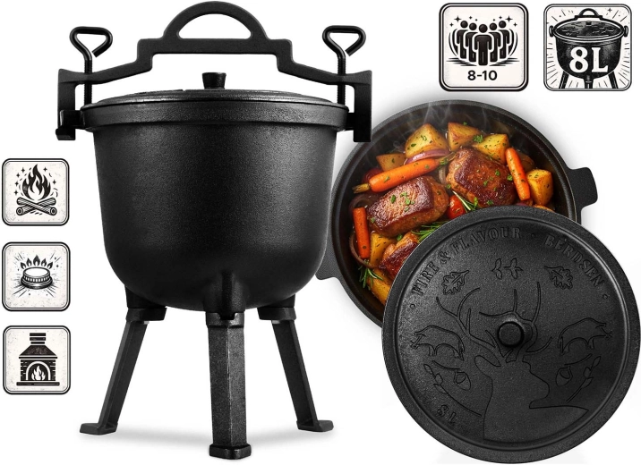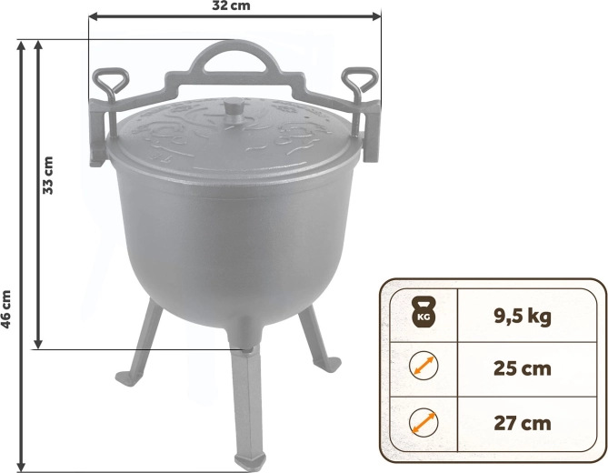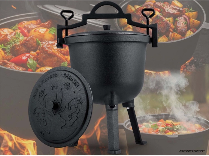 Den store kapacitet på 8 l mætter både familie og venner. Fungerer glimrende om sommeren ved grillen og om vinteren ved bålet – til gullash, stegeretter og fyldige supper.