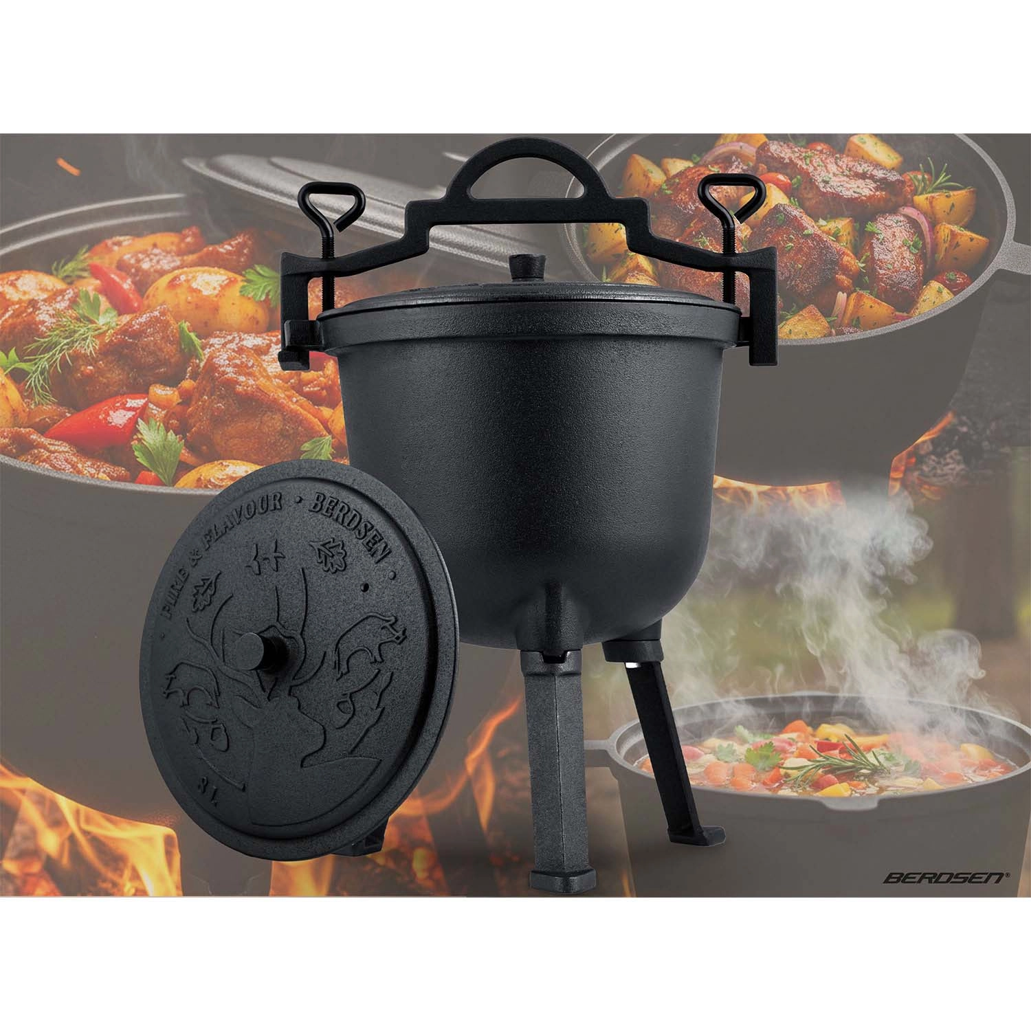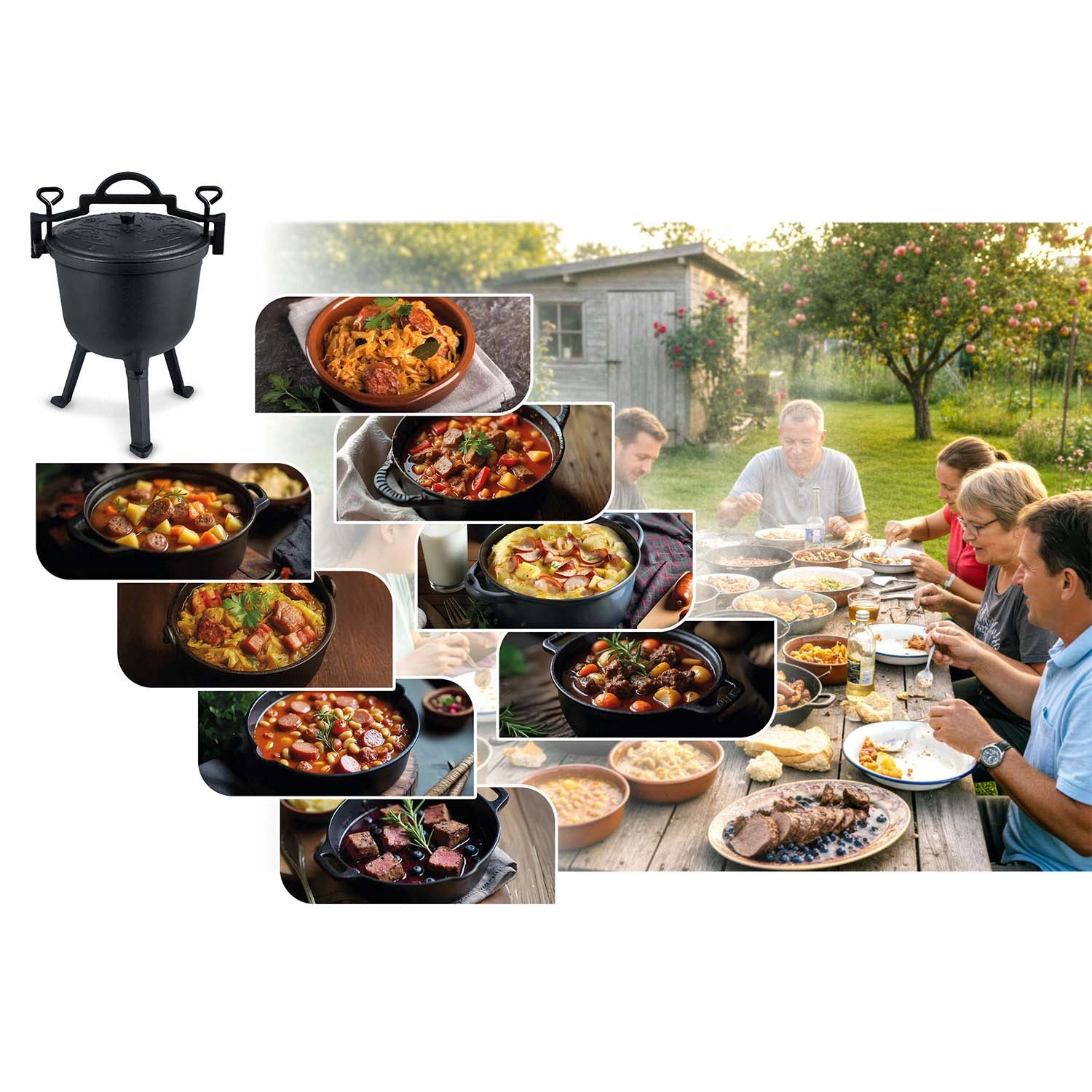 Konstruktionen er designet til maksimal fleksibilitet: Stil gryden på den skruebare trefod med stabile fødder, hæng den op i det kraftige bøjlehåndtag over flammen, eller brug den uden ben på et gasblus. Det tunge låg med udluftning holder på damp og aroma, så alt forbliver saftigt.