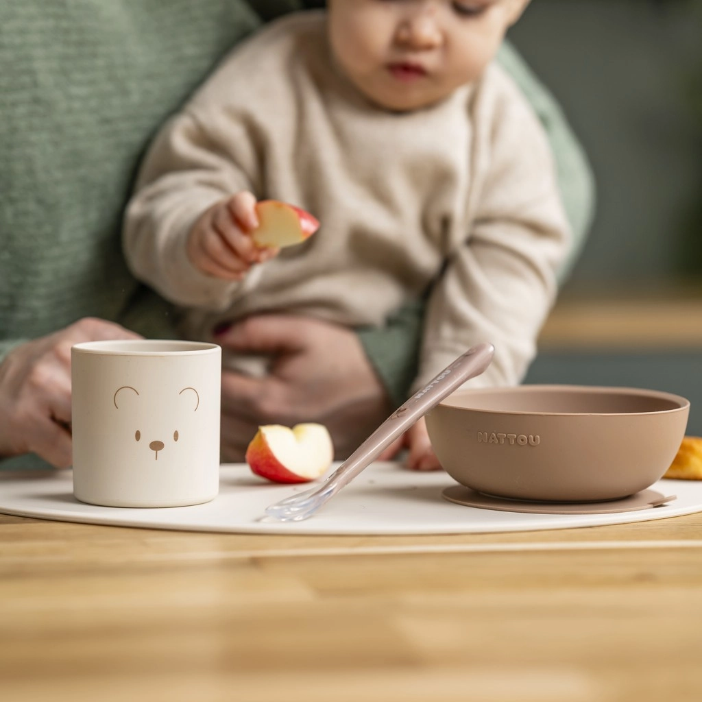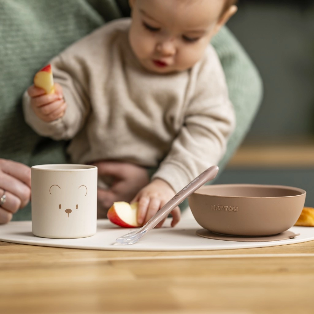 Dette Nattou spisesæt i silikone er designet til at støtte barnets første skridt mod at spise selv. Den bløde og holdbare silikone er behagelig at røre ved, sikker for barnets gummer og modstår samtidig daglig brug uden at sprække eller gå i stykker. Den neutrale farve natural passer nemt ind i et moderne interiør.