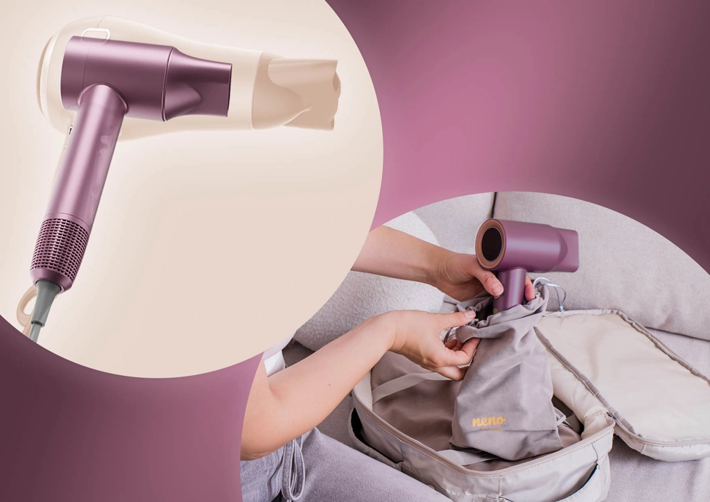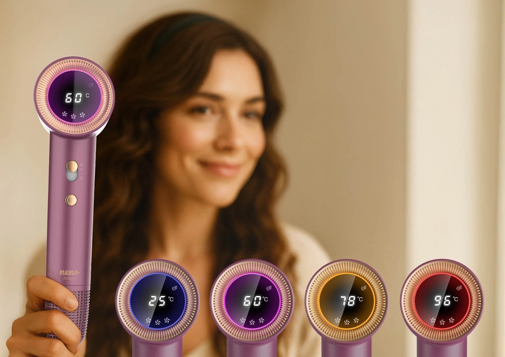 Neno Beauty Silvia kombinerer moderne teknologi og daglig komfort. Takket være avanceret ionisering elimineres statisk elektricitet, kutikula lukkes, og håret efterlades glat og glansfuldt. Den intelligente sensor overvåger temperaturen op til 100× pr. sekund og beskytter håret mod overophedning og skader. LED‑displayet med farvet ring viser tydeligt både temperatur og luftstrømshastighed, så du har stylingen under fuld kontrol med ét blik.