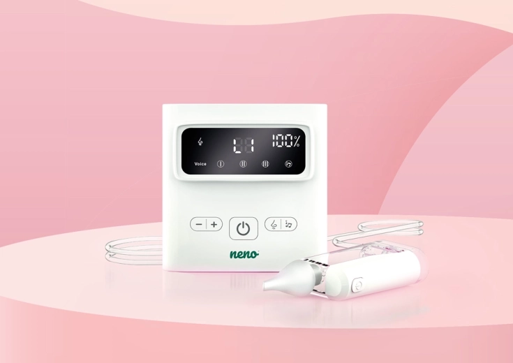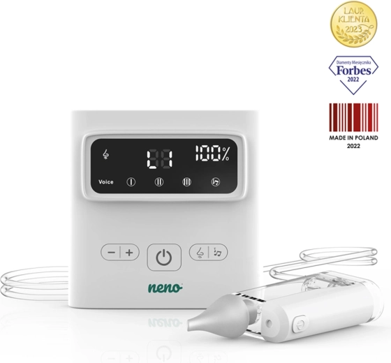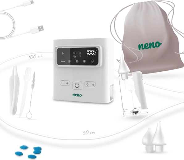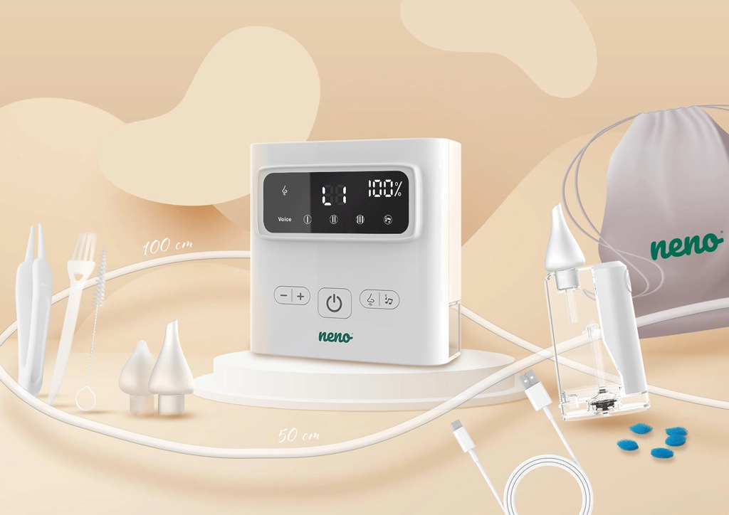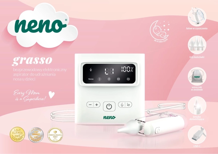 Den trådløse næsesuger Neno Grasso løsner nænsomt og effektivt en tilstoppet næse hos spædbørn og børn op til 6 år. Den tilbyder op til 9 sugeniveauer, Active Airflow-teknologi for skånsom sugning uden irritation, 3 silikonehoveder til forskellige alderstrin samt beroligende melodier og hvid støj for en roligere rensning. Med USB‑C-opladning, trådløs drift og LED-belysning er den ideel både hjemme og på farten.