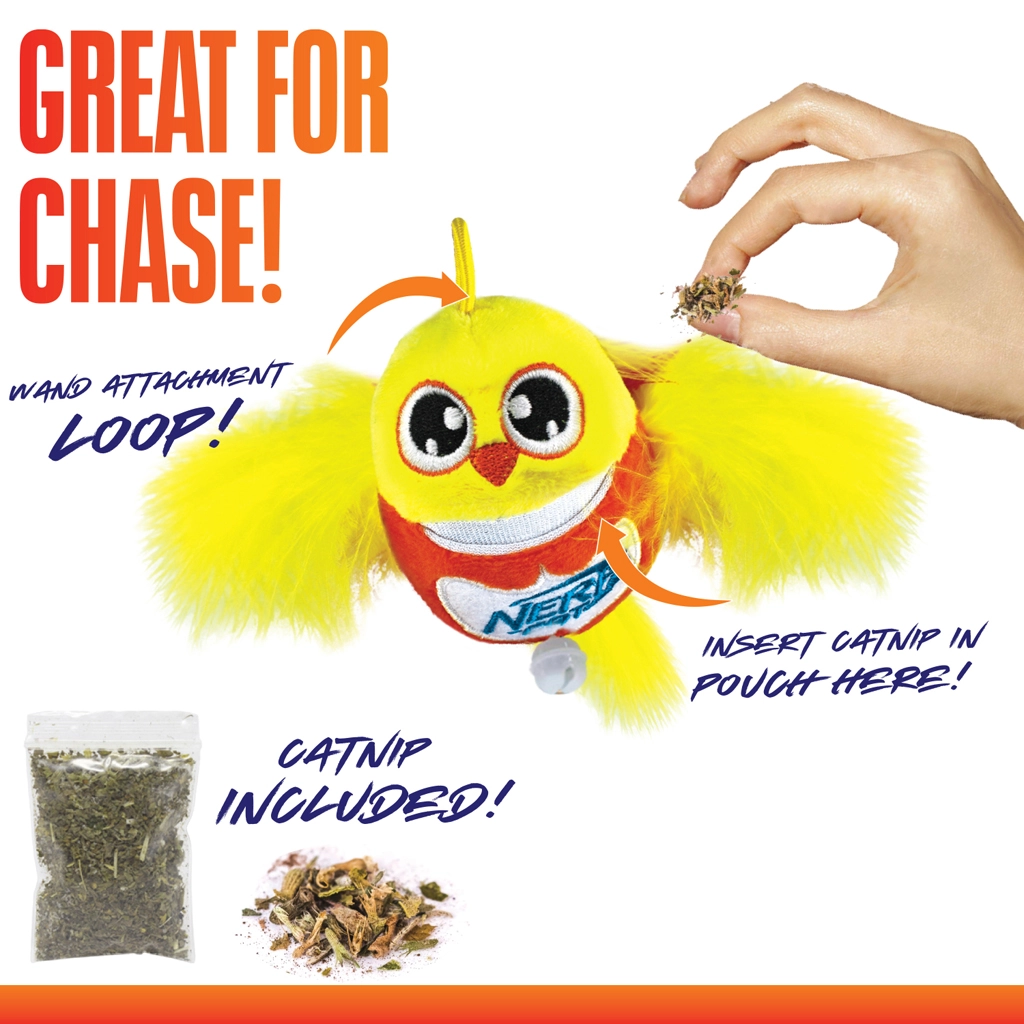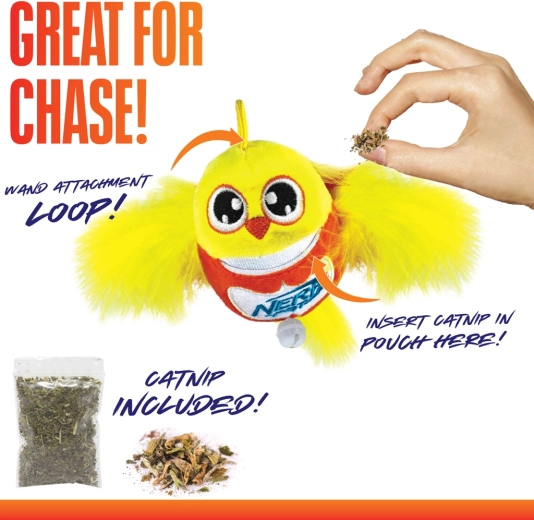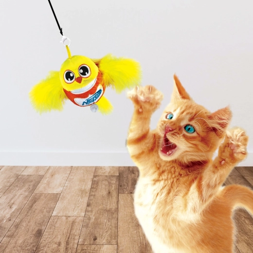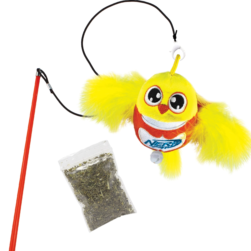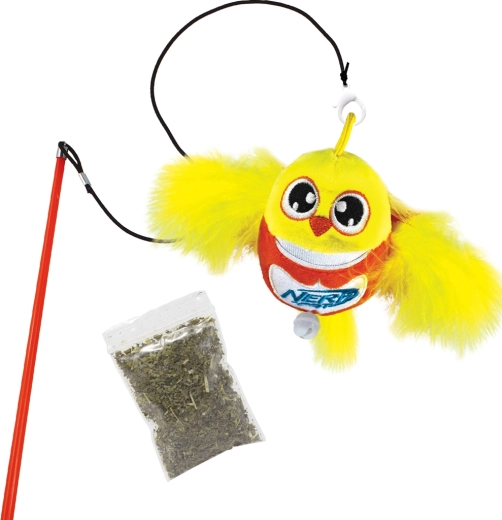 Forkæl din kat med det realistiske interaktive legetøj NERF CAT. Den bløde plysbird med fjer eller frynser bevæger sig naturligt, når du svinger stangen, og sammen med klokken fanger den både syn og hørelse. Den medfølgende pose med katteurt øger motivationen og forlænger legetiden.