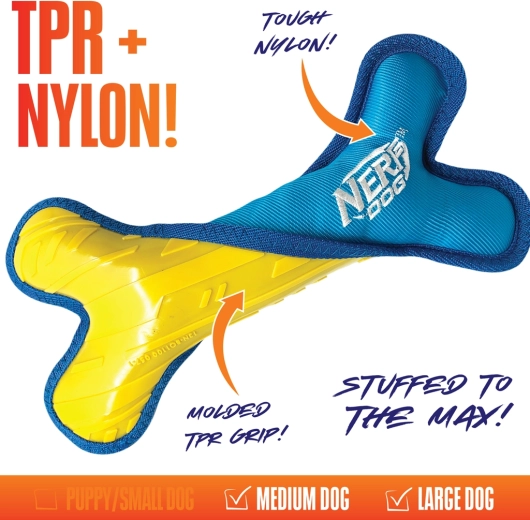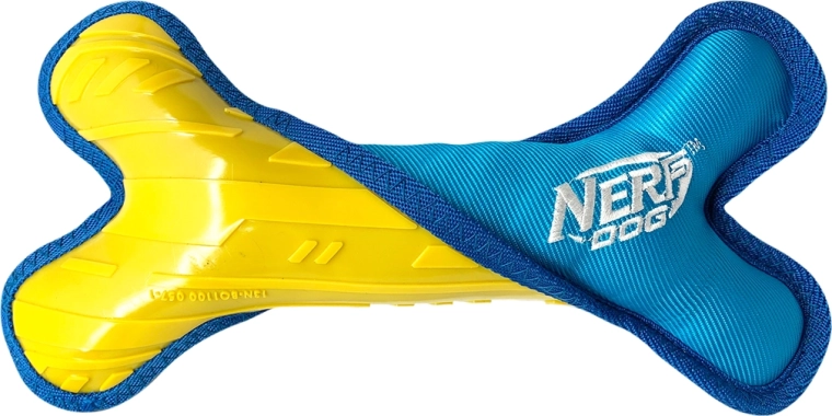 Nerf Dog-benets smarte materialekombination balancerer holdbarhed og komfort. Indvendigt findes en robust TPR-kerne for lang levetid, mens det ydre lag af plys-nylon er skånsomt mod tænder og tandkød. Den indre polyethylenfyld giver volumen og en indbydende tekstur, der motiverer hunde til leg.