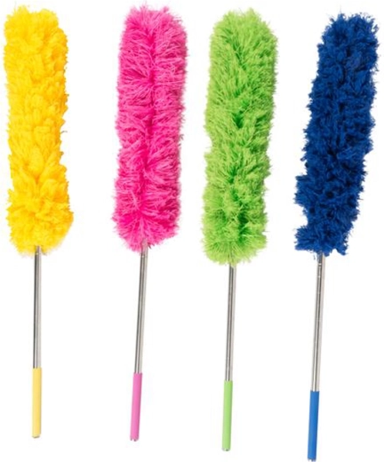 Den ergonomiske konstruktion sikrer behageligt greb og nem betjening. Den teleskopiske mekanisme muliggør trinløs justering af længden, så støvkosten kan tilpasses den aktuelle opgave. Fås i mix af farver – hvis du foretrækker en bestemt farve, angiv den i bemærkningen i trin nr. 3; ellers sender vi et tilfældigt valg.