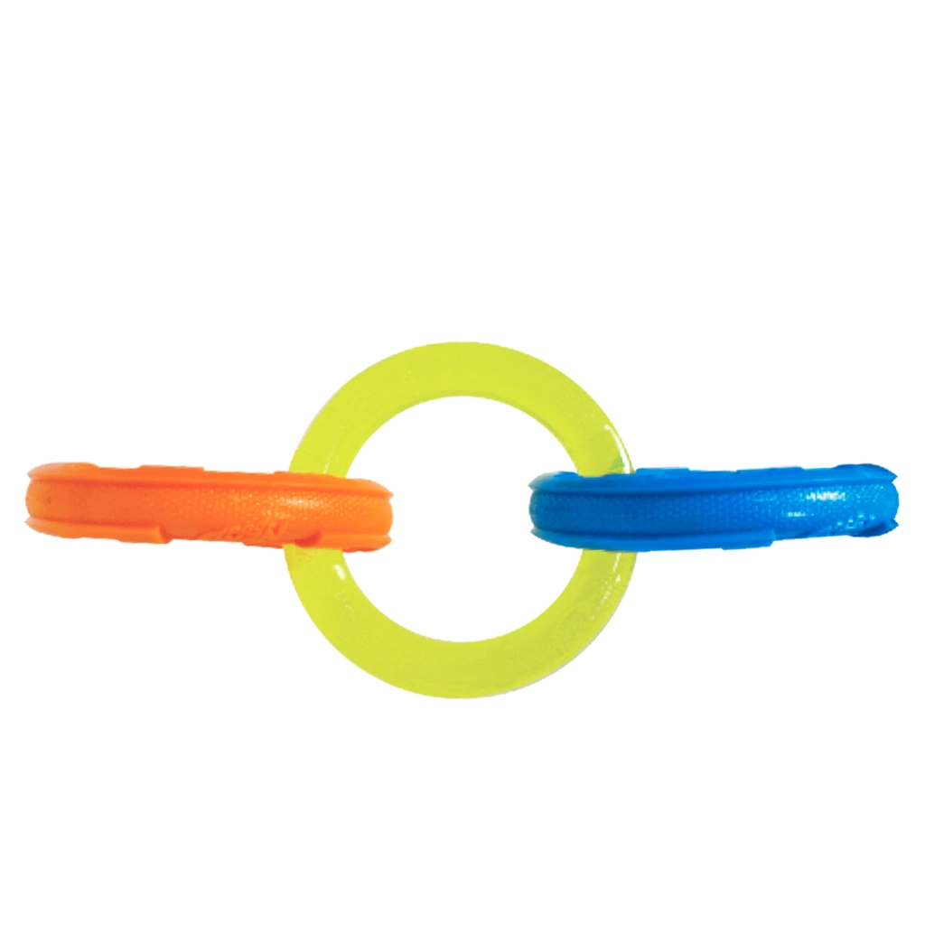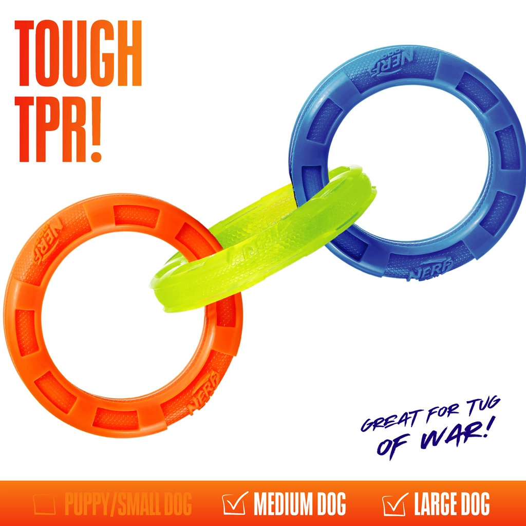 Holdbart interaktivt hundelegetøj med tre sammenkoblede ringe til træk og apport. Med en længde på 26,7 cm er det ideelt til mellemstore og store racer. Vandtæt udførelse, riflet tekstur for sunde tænder og tandkød og lette, men ekstraordinært holdbare Nerf Tough-materialer sikrer langvarig sjov og sikker leg både ude og inde.