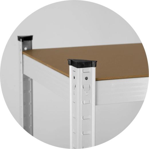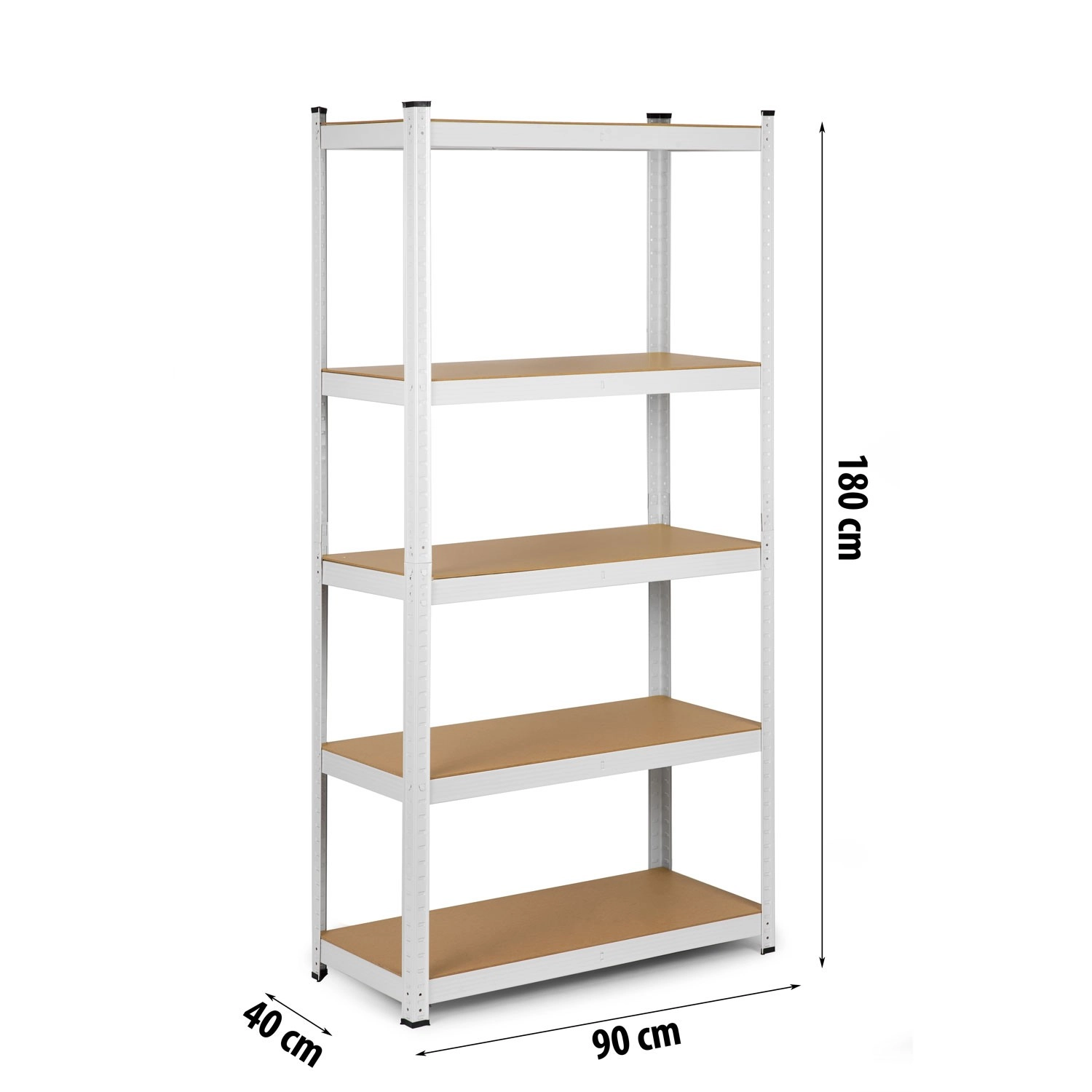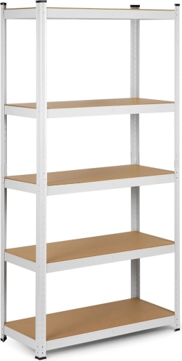 Fem robuste MDF-hylder med midterafstivninger bærer 175 kg pr. hylde – ideelt til værktøj, kasser og forråd.