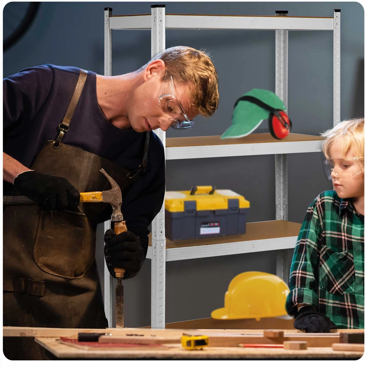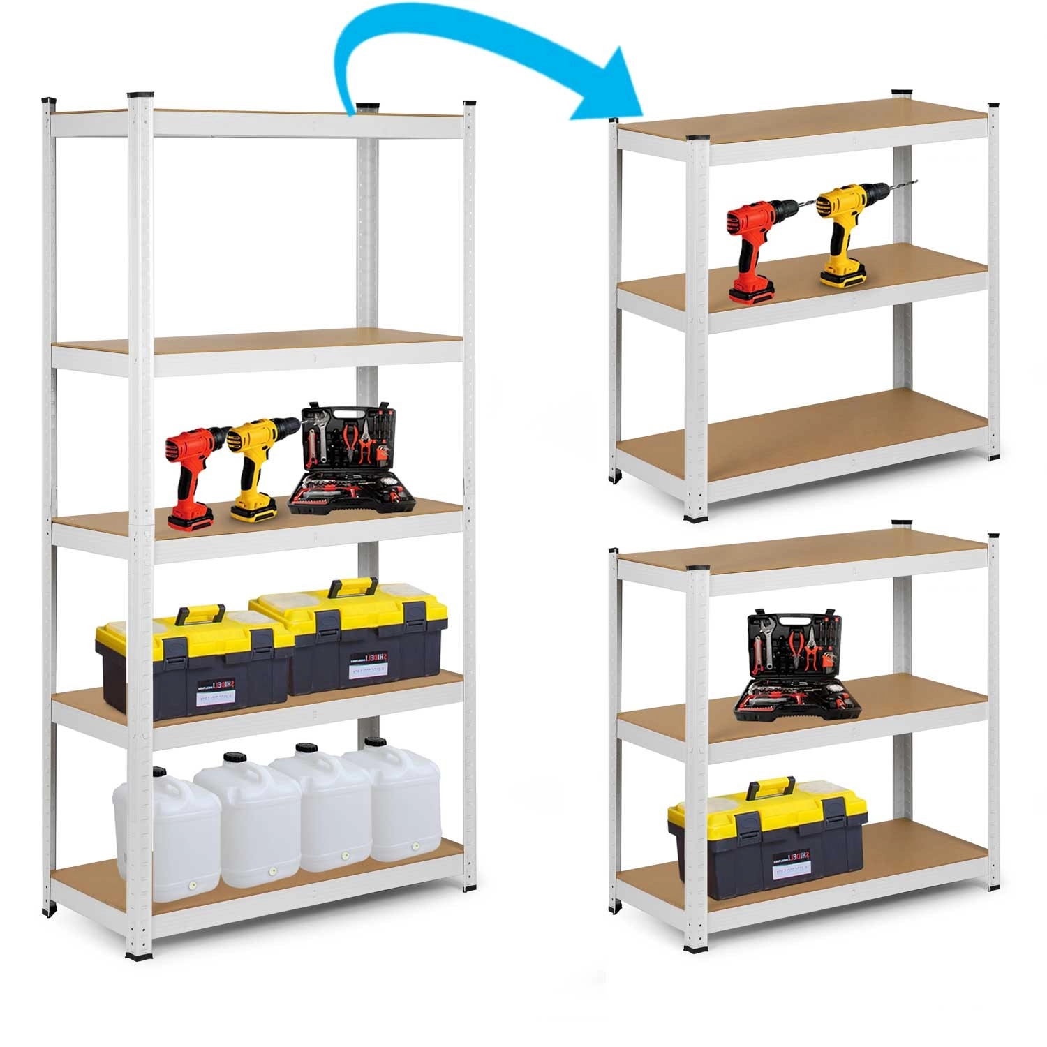 Den smarte konstruktion gør det muligt at dele reolen i to lavere enheder eller bruge den som et værkstedsbord. Det hurtige klikmonteringssystem uden skruer sparer tid, beskyttende plastfødder øger stabiliteten og skåner gulve, mens afrundede kanter sikrer sikker brug.