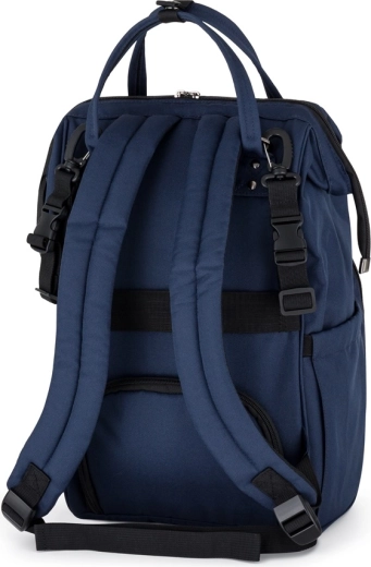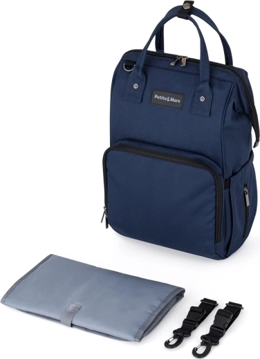 En stilfuld og funktionel skifteryksæk til barnevogn Petite&Mars Jackob i mørkeblå farve, der tilbyder lav vægt, fremragende organisering og holdbare materialer mod fugt. Takket være 11 lommer, inklusive termolommer, vandtæt lomme til våde ting og hurtig sideadgang, har du altid alt til baby og forældre lige ved hånden. Der medfølger en puslepude, tasken fastgøres nemt til barnevognen og vejer kun 800 g.