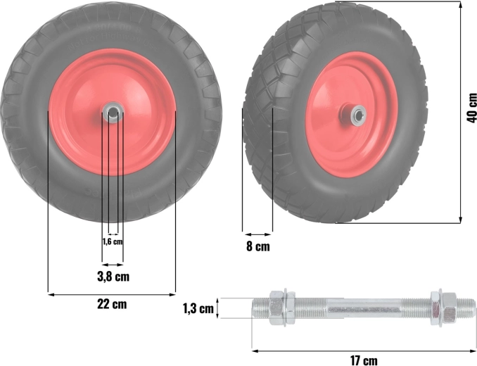 Velegnet til trillebøre, have- og transportvogne samt værkstedsapplikationer. Nem montering takket være den medfølgende galvaniserede aksel og den standardiserede lejehuldiameter på 1,6 cm.