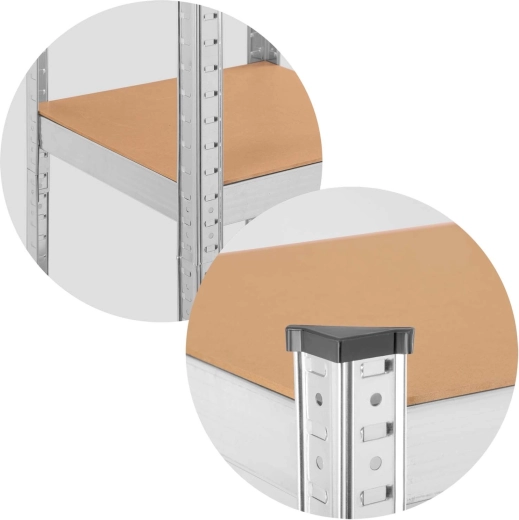 Den robuste HUMBERG-reol er ideel til overskuelig og sikker opbevaring af værktøj, kasser og forsyninger. Stålprofiler og afstivere under MDF-hylderne sikrer høj stabilitet og lang levetid. Hver hylde kan bære op til 100 kg, hvilket giver en samlet bæreevne på 500 kg.