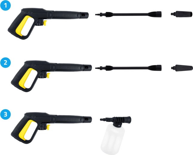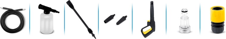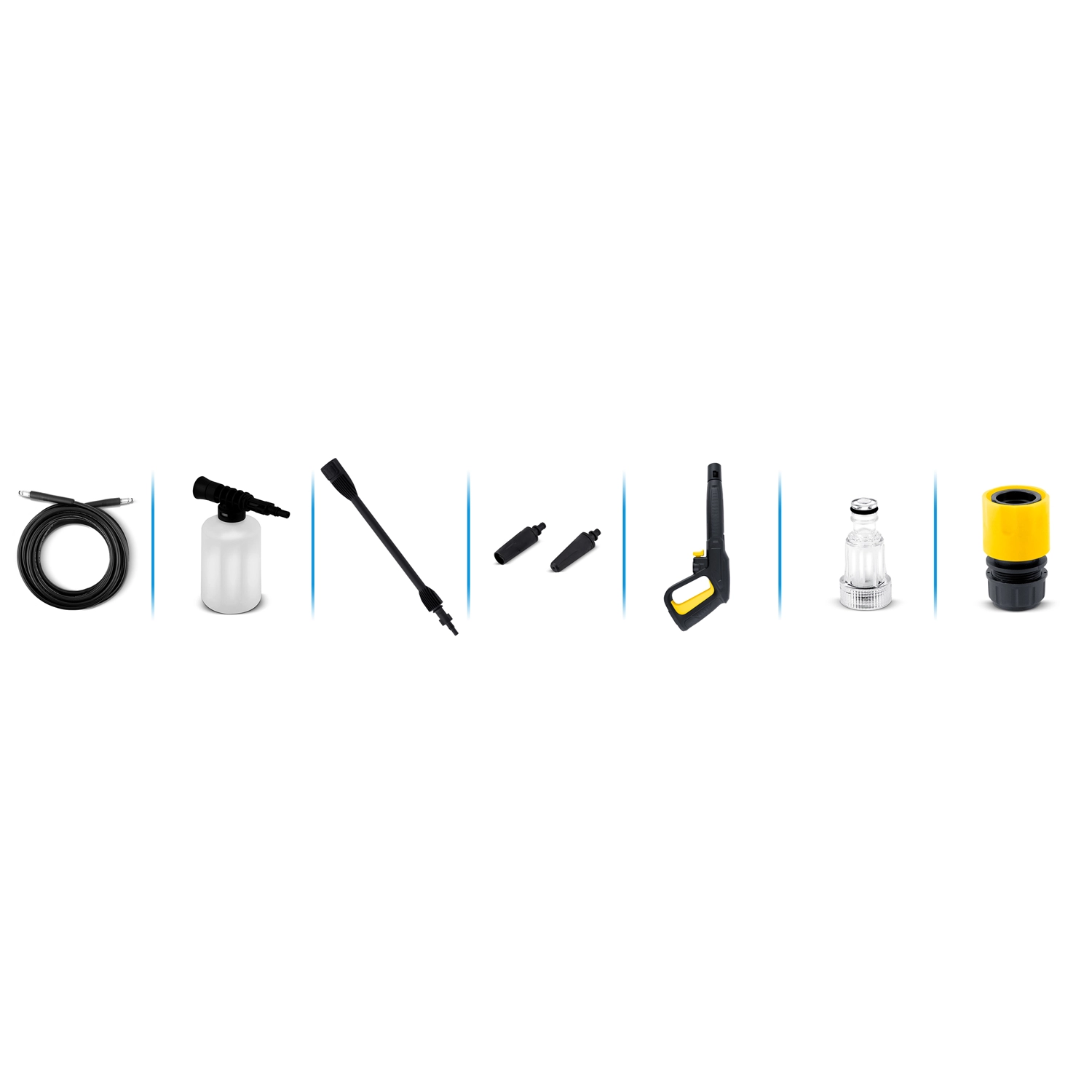 - lanse med justerbar dyse, turbodyse, 6 m højtryksslange, vandtilslutning, lynkobling, flaske til rengøringsmiddel 450 ml, rense-nål til dyser, 5 m strømkabel