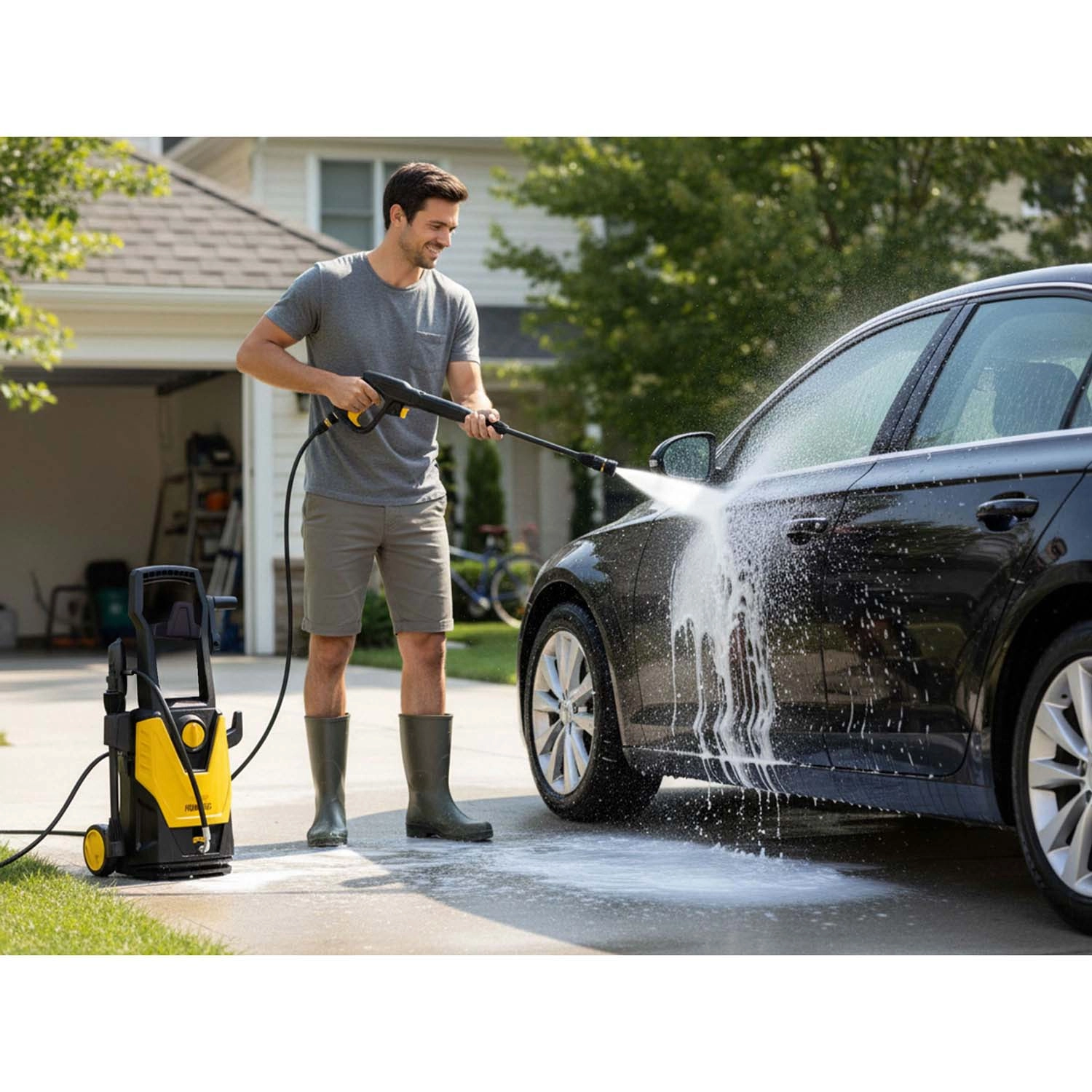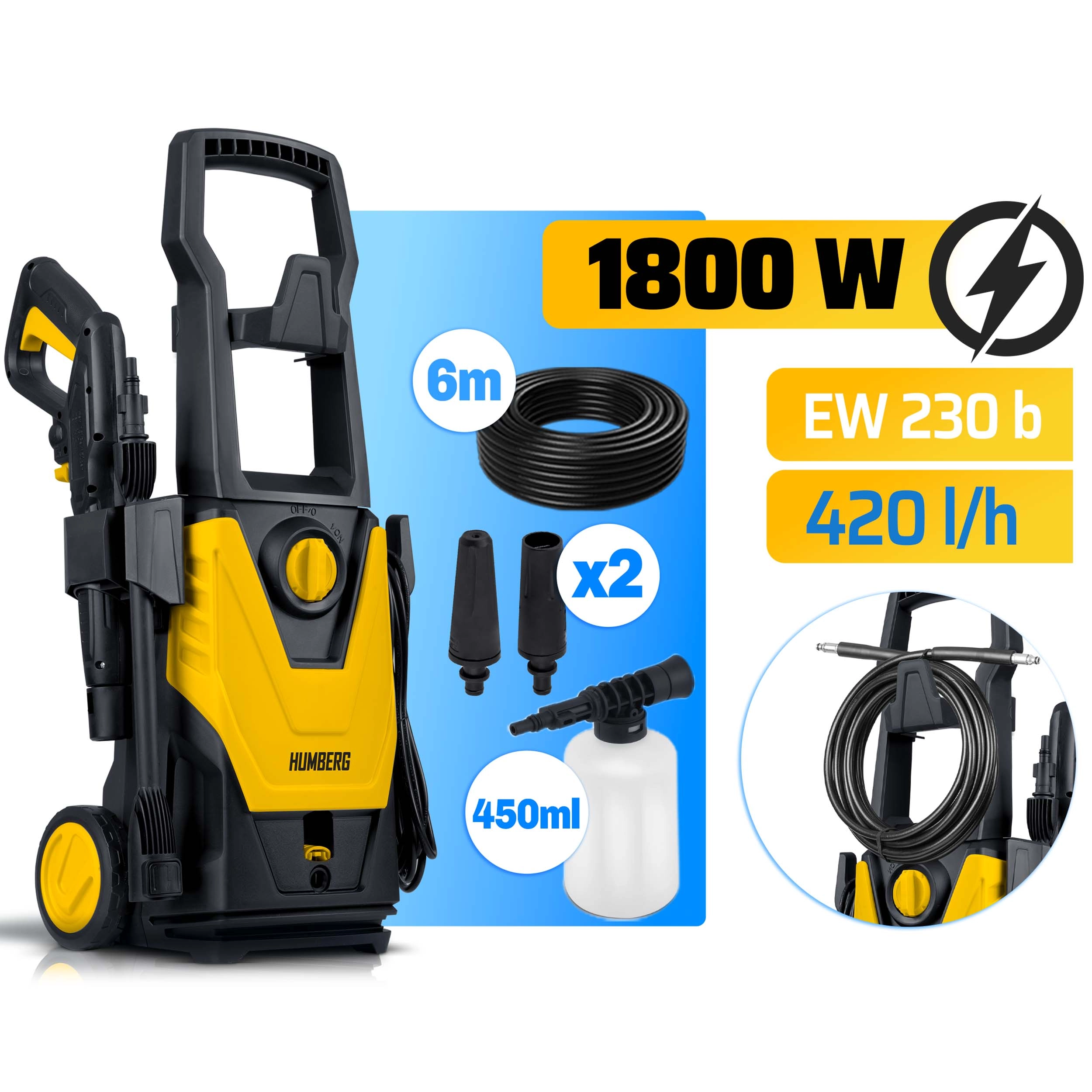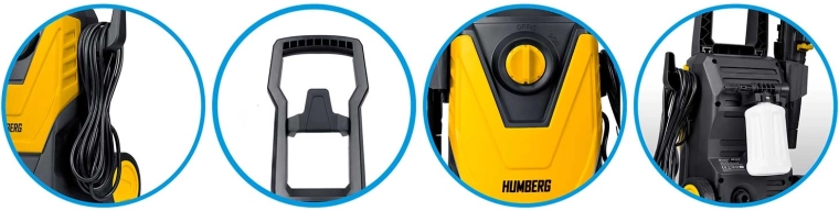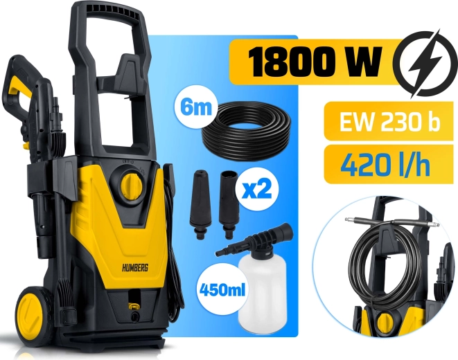HUMBERG HM-300 er en pålidelig højtryksrenser til daglig vedligeholdelse omkring huset. Den selvansugende aluminiumpumpe gør det muligt at tage vand fra en tønde eller tank, så du er uafhængig af vandforsyningen. Med den justerbare dyse og turbodysen TurboStream™ fjerner du nemt genstridigt snavs fra belægning, hegn og bilens karrosseri. Skumlansen på 450 ml doserer rengøringsmiddel jævnt for skånsom og effektiv vask.