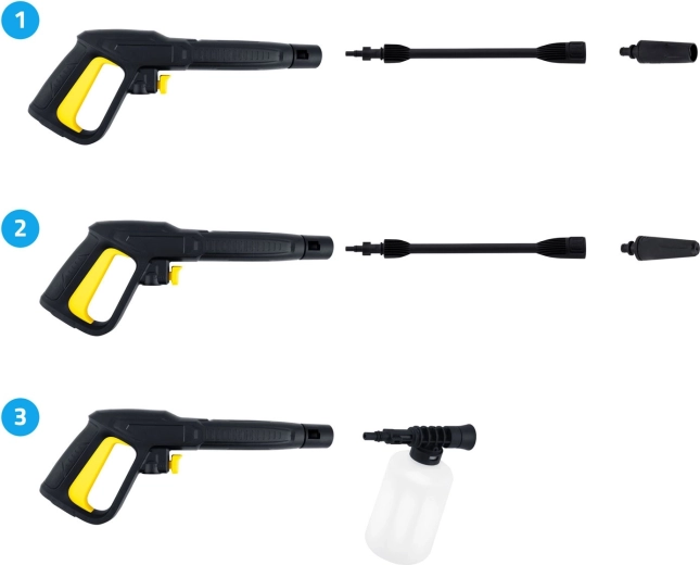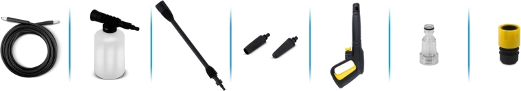 - Komplet udstyr i pakken: justerbar dyse, turbodyse, 6 m slange, lynkobling, 450 ml rengøringsflaske, rense-nål, 5 m strømkabel.