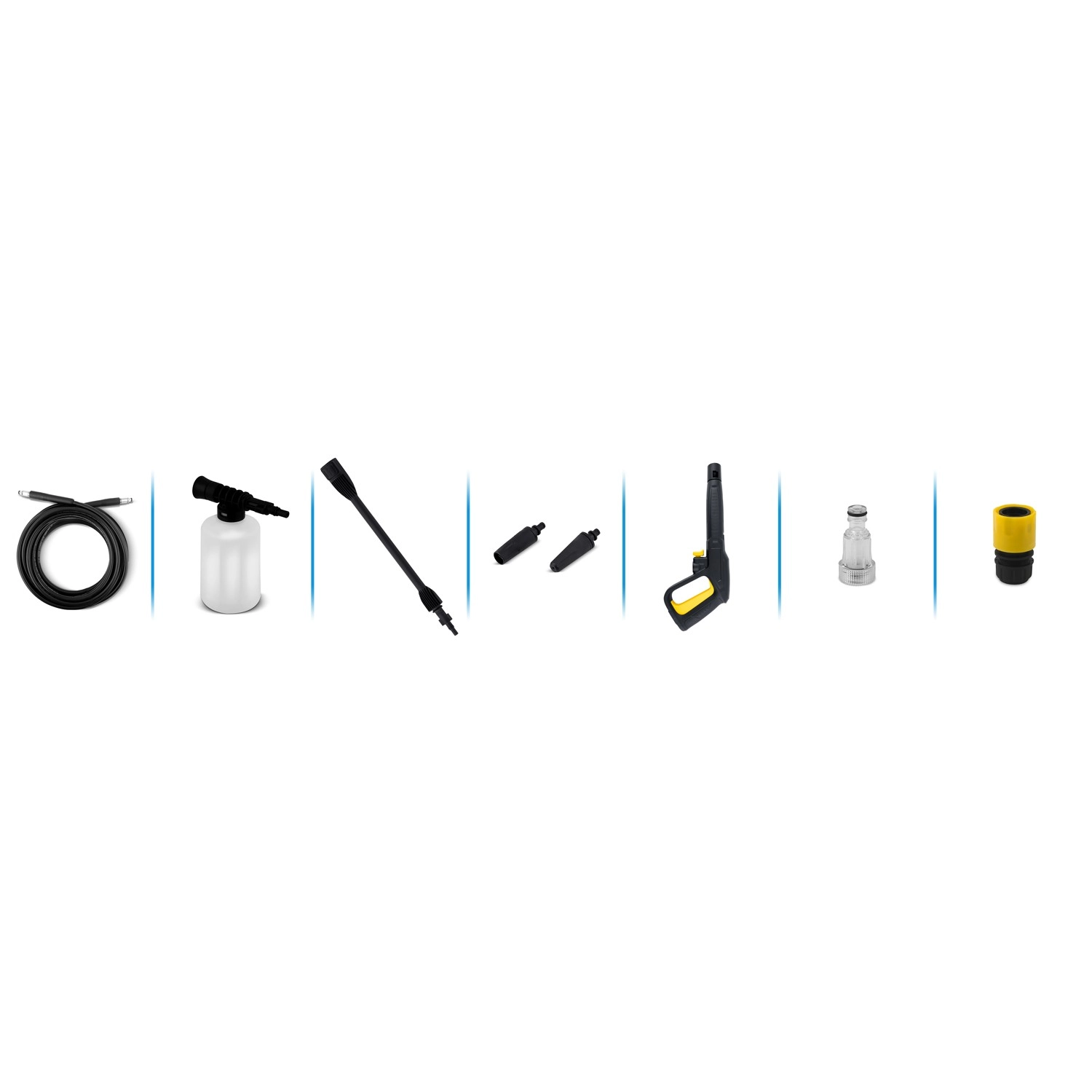 - justerbar dyse, TurboStream™ turbodyse, 6 m højtryksslange, lynkobling og vandtilslutning, 450 ml rengøringsflaske med regulering, rense-nål, 5 m strømkabel, integreret vandfilter