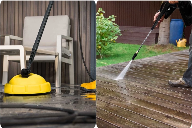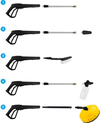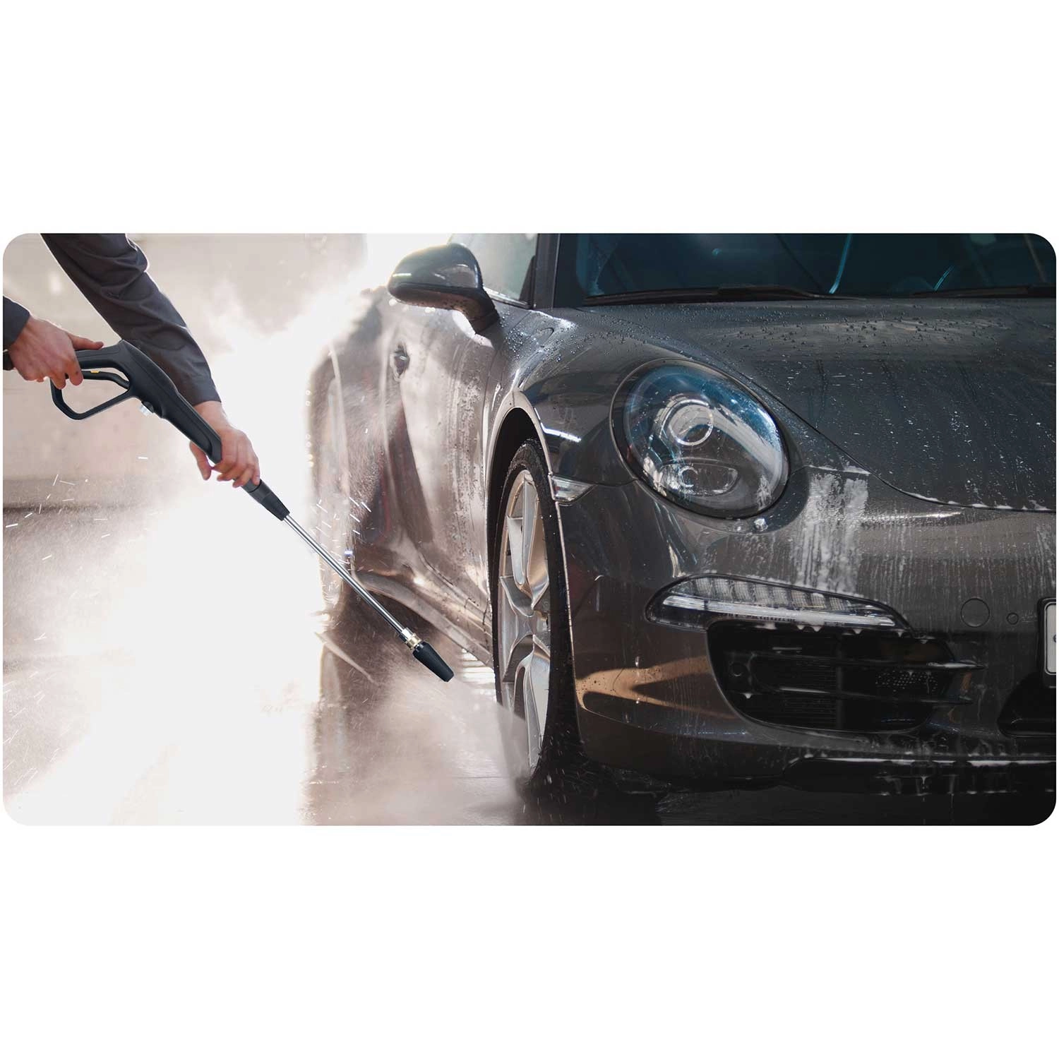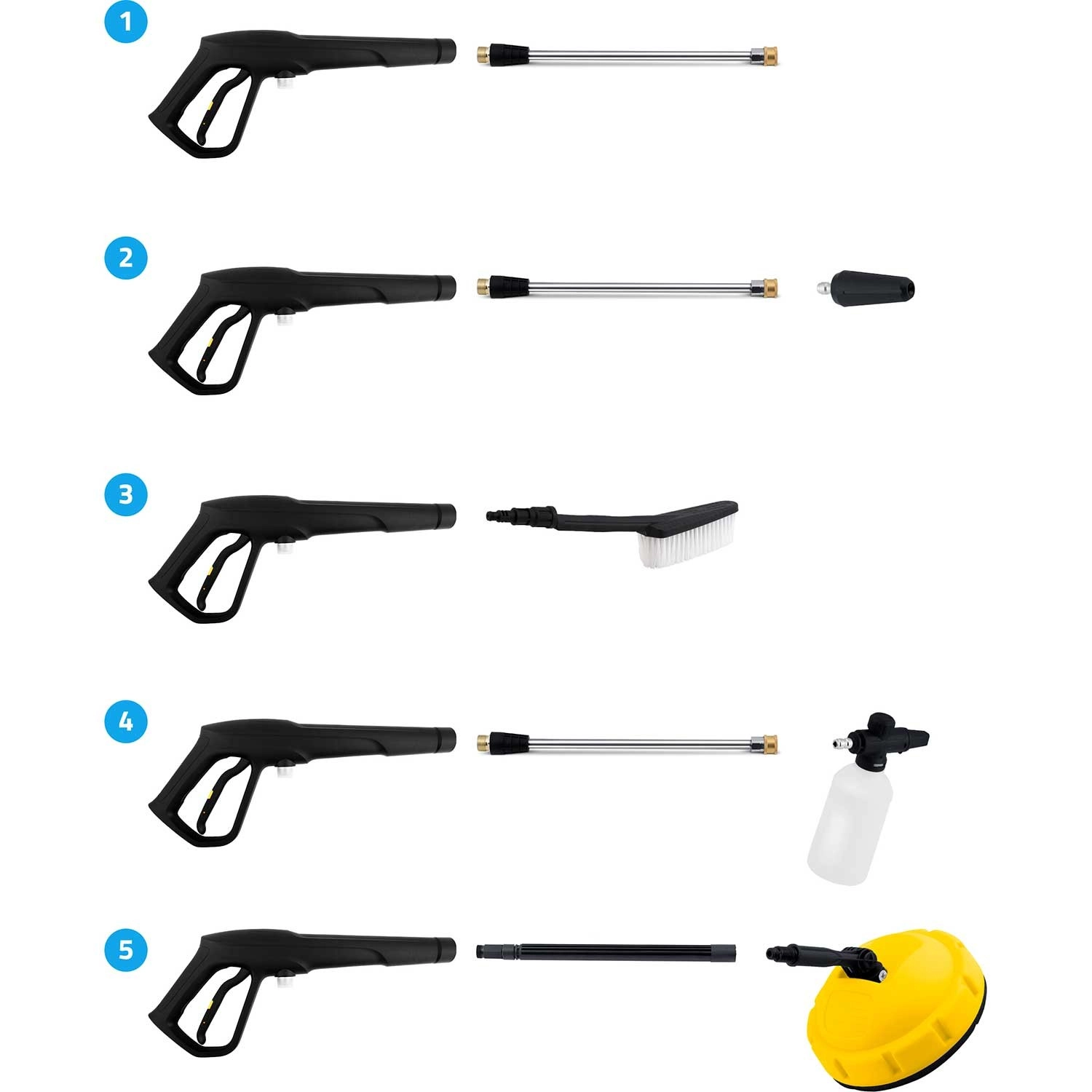 Fire udskiftelige dyser, turbodyse, terrassevasker, 500 ml beholder til rengøringsmiddel og fælg-børste. Skift mellem skånsom skylning og kraftig stråle på et øjeblik.