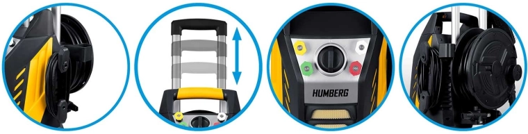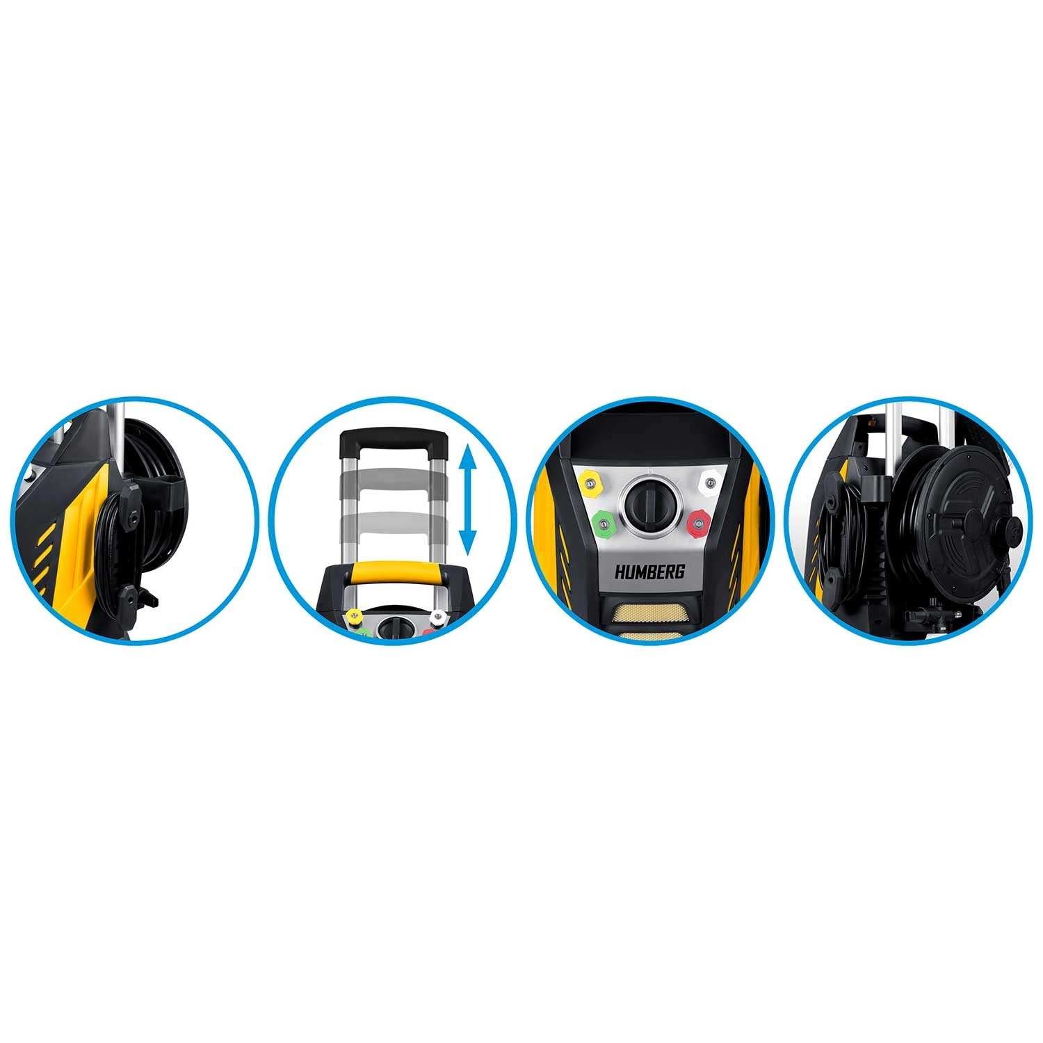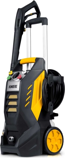 Den kompakte elektriske højtryksrenser Humberg HM-302 leverer en effekt på 2500 W, maksimalt tryk op til 195 bar og en vandmængde på 480 l/t. Takket være TurboStream2-turbodyse, StopAndSafe2-systemet og et rigt udvalg af tilbehør rengør du bil, terrasse, stier og havemøbler hurtigt og effektivt. Den praktiske slangetromle, teleskophåndtag og store hjul sikrer nem håndtering og bekvem opbevaring.