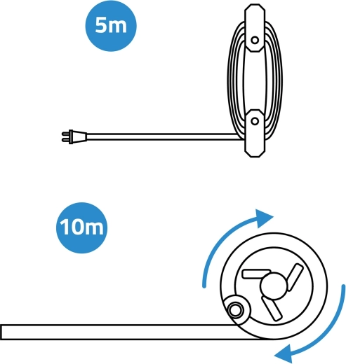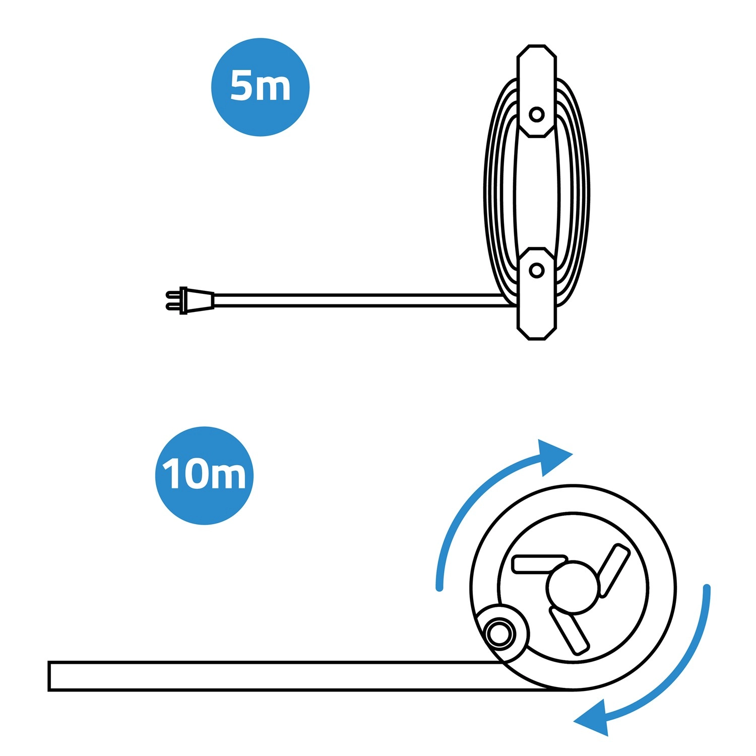 Den integrerede slangenav sparer plads og tid. Teleskopisk aluminiums-håndtag og store hjul sikrer bekvem transport på gårdspladsen og i garagen.