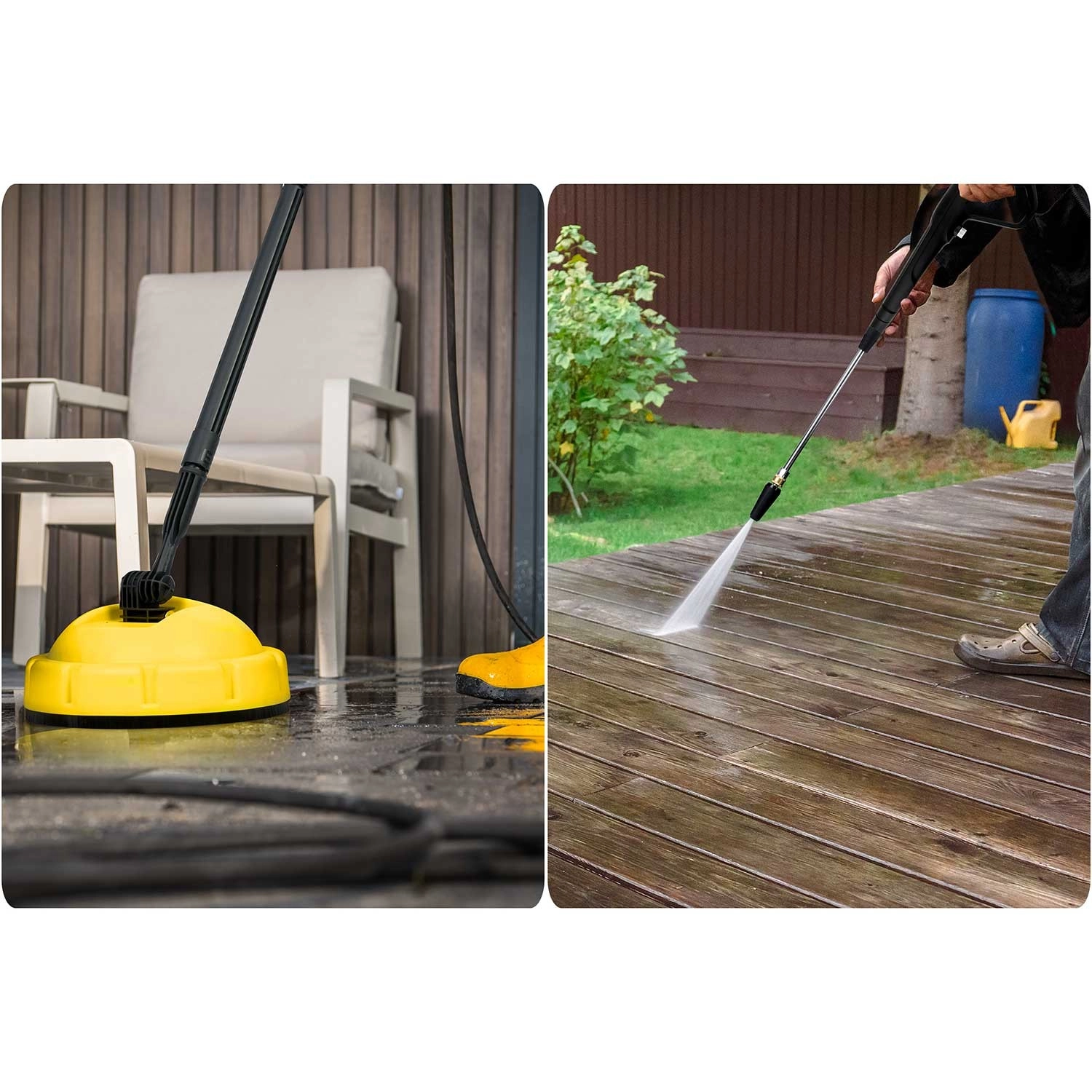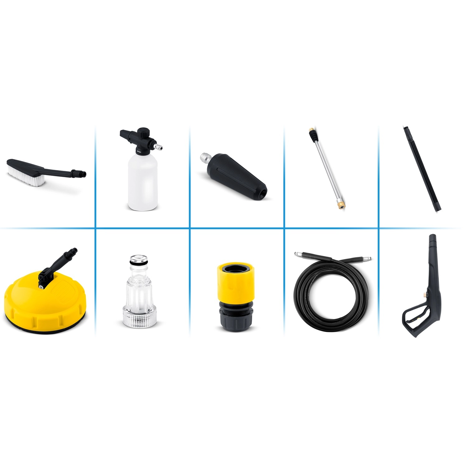 - lanse med regulering, TurboStream2 turbodyse, 4 vinkel-dyser (09/159/259/409), terrassevasker, børste til hjul, 500 ml beholder til rengøringsmiddel med regulering, vandfilter, hurtigkobling, tilslutningsadapter, rense-nål